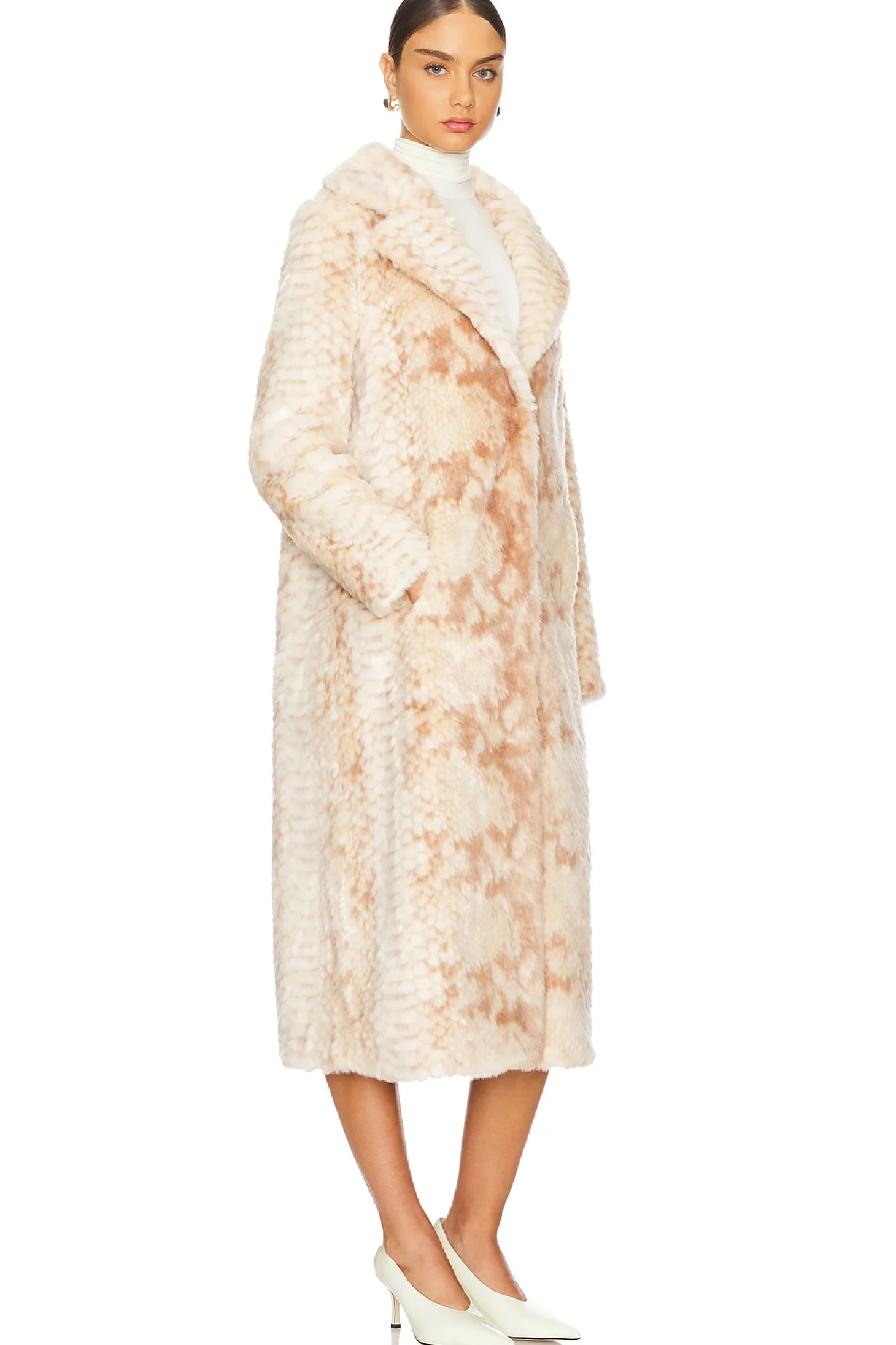 Self: 50% modacrylic 50% acrylic Lining: 100% polyester.Made in China.Dry clean.Hidden hook and eye closure.Side seam pockets.Faux fur with python patterning and lapel