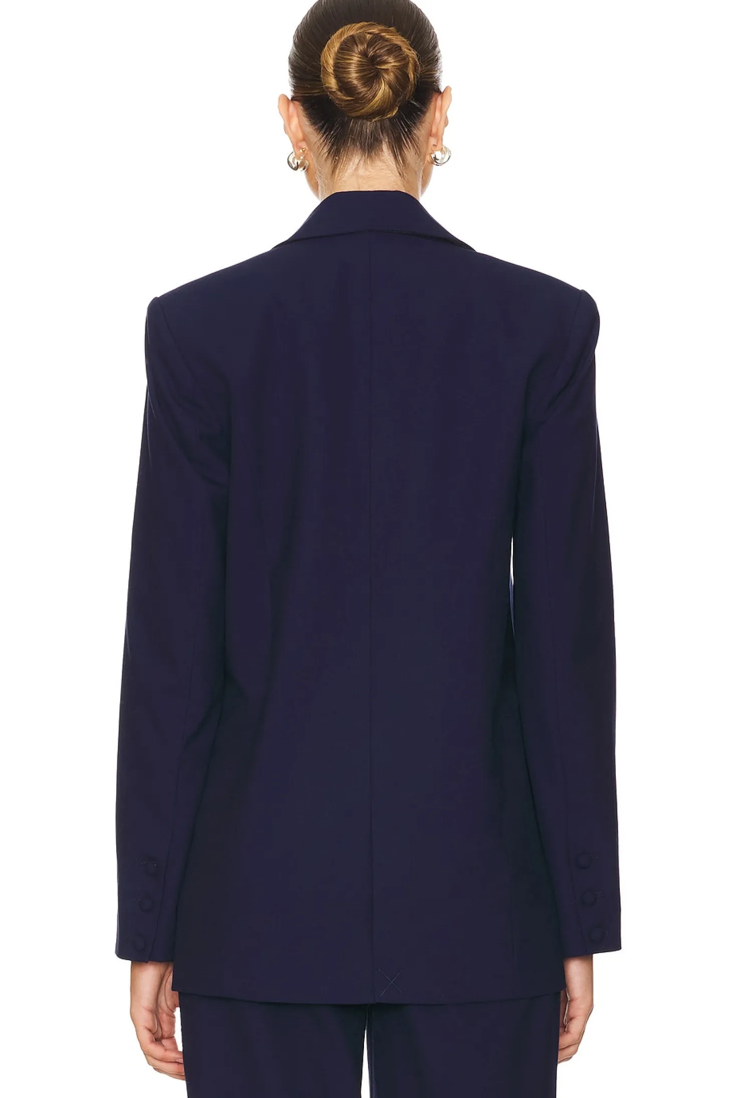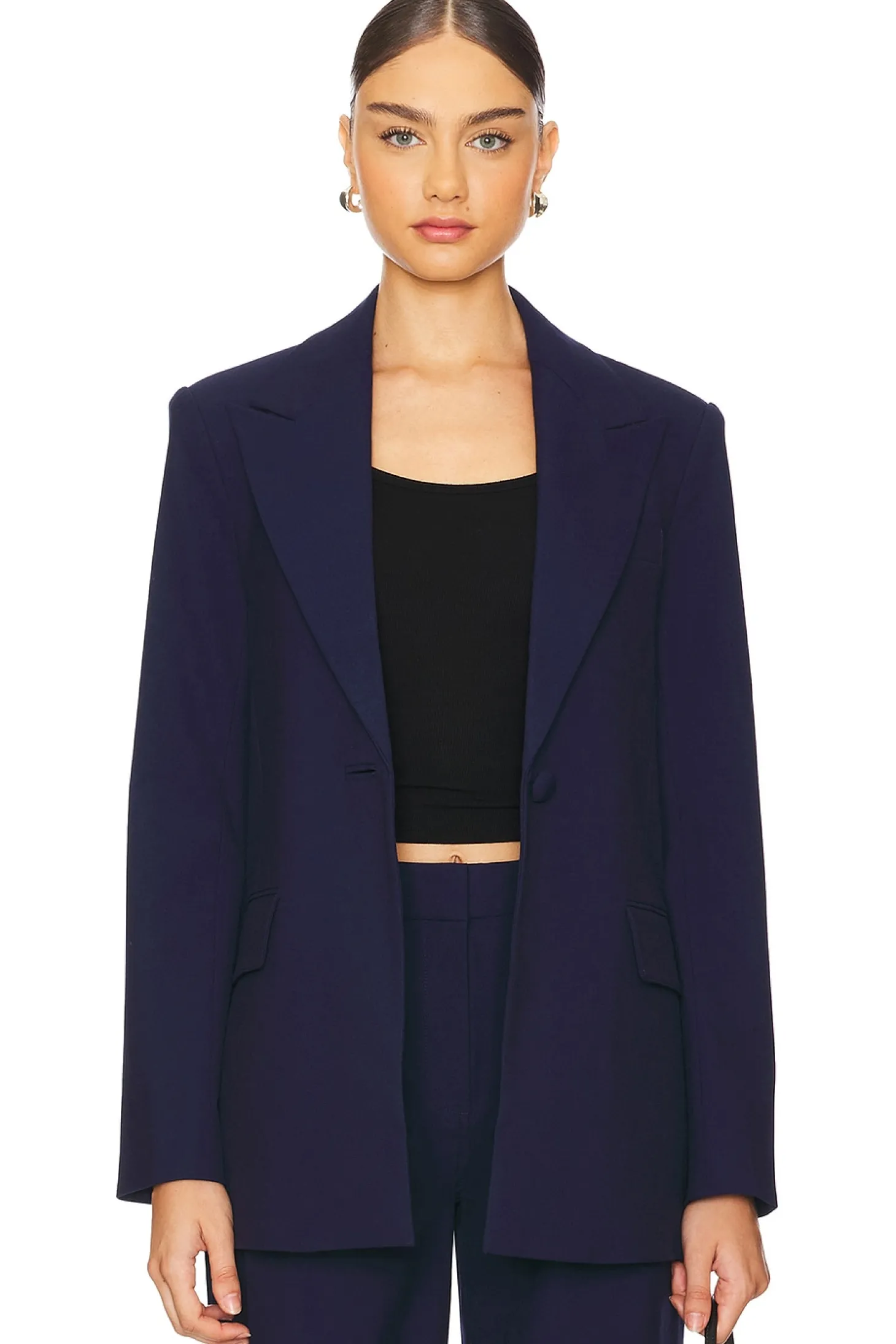 Self: 66% polyester 30% viscose 4% elastane Lining: 97% polyester 3% elastane.Made in China.Dry clean only.Singular front button closure.Padded shoulders.3-pocket design.Button cuffs.Midweight suiting fabric Item not sold as a set