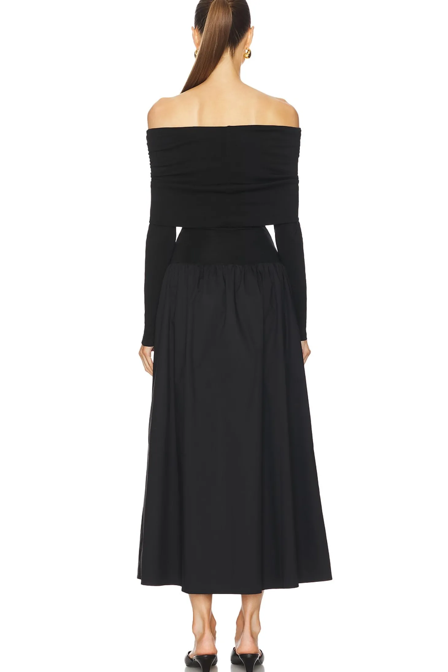 Self: 53% cotton 40% nylon 7% spandex Contrast: 65% tencel 28% wool 7% spandex Bodice Lining: 100% polyester Skirt Lining: 100% cotton.Made in China.Hand wash.Fully lined.Pull-on styling with elastic neckline.Poplin skirt.Jersey bodice with foldover neckline.Neckline to hem measures approx 51" in length