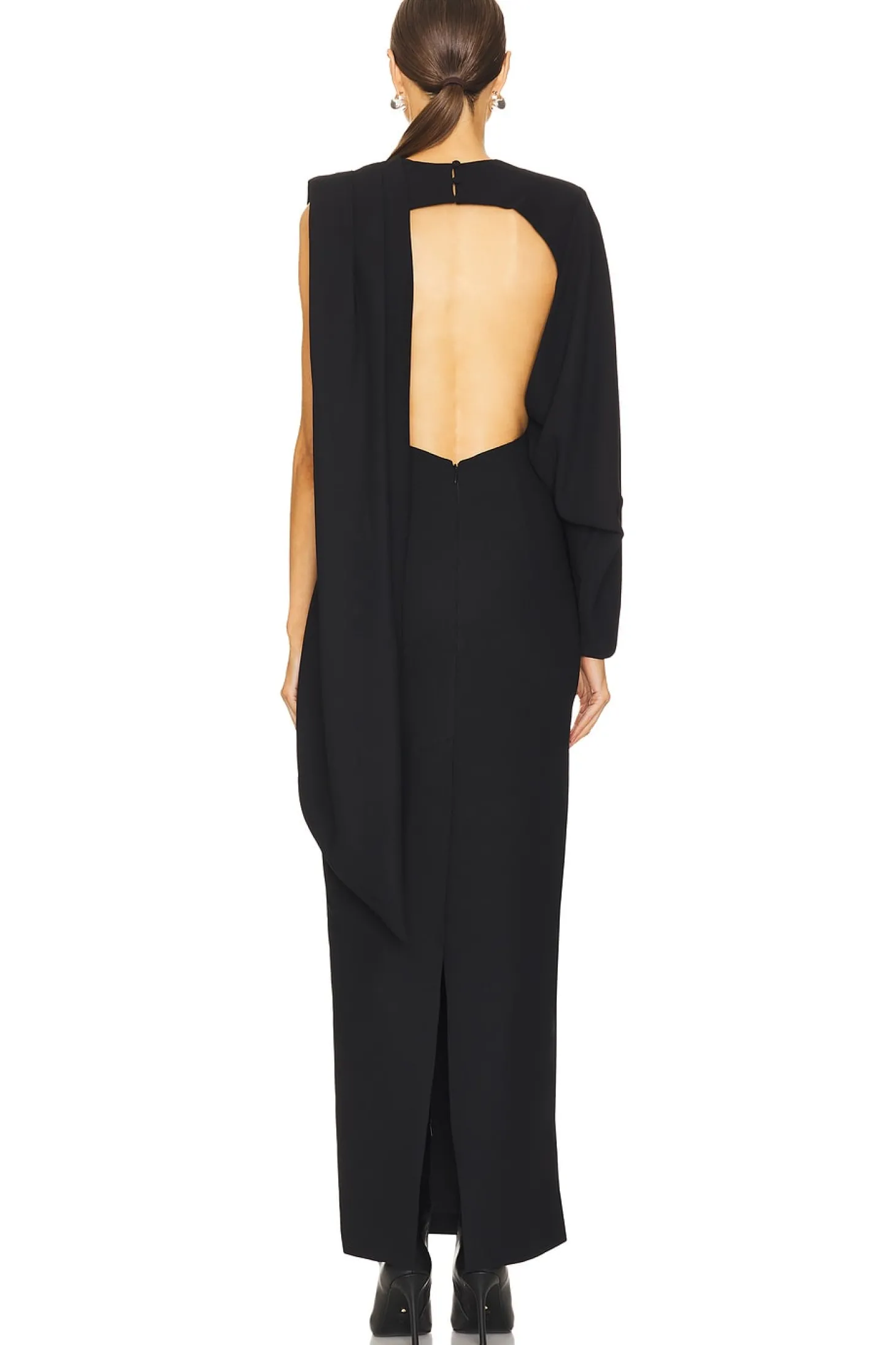 100% polyester.Made in China.Dry clean only.Fully lined.Partial hidden back zipper and open back with button closure.Single sleeve design with drapping cape accent.Lightweight crepe fabric with single padded shoulder and back vent