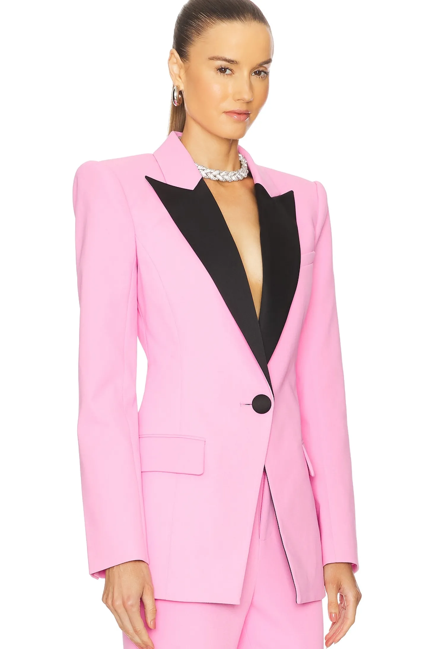 Self: 100% polyester Collar: 85% polyester 15% viscose Lining: 97% polyester 3% spandex.Made in China.Dry clean only.Single breasted closure.Front flap pockets and single breast pocket Buttoned cuffs.Crepe fabric with padded shoulders.Item not sold as set