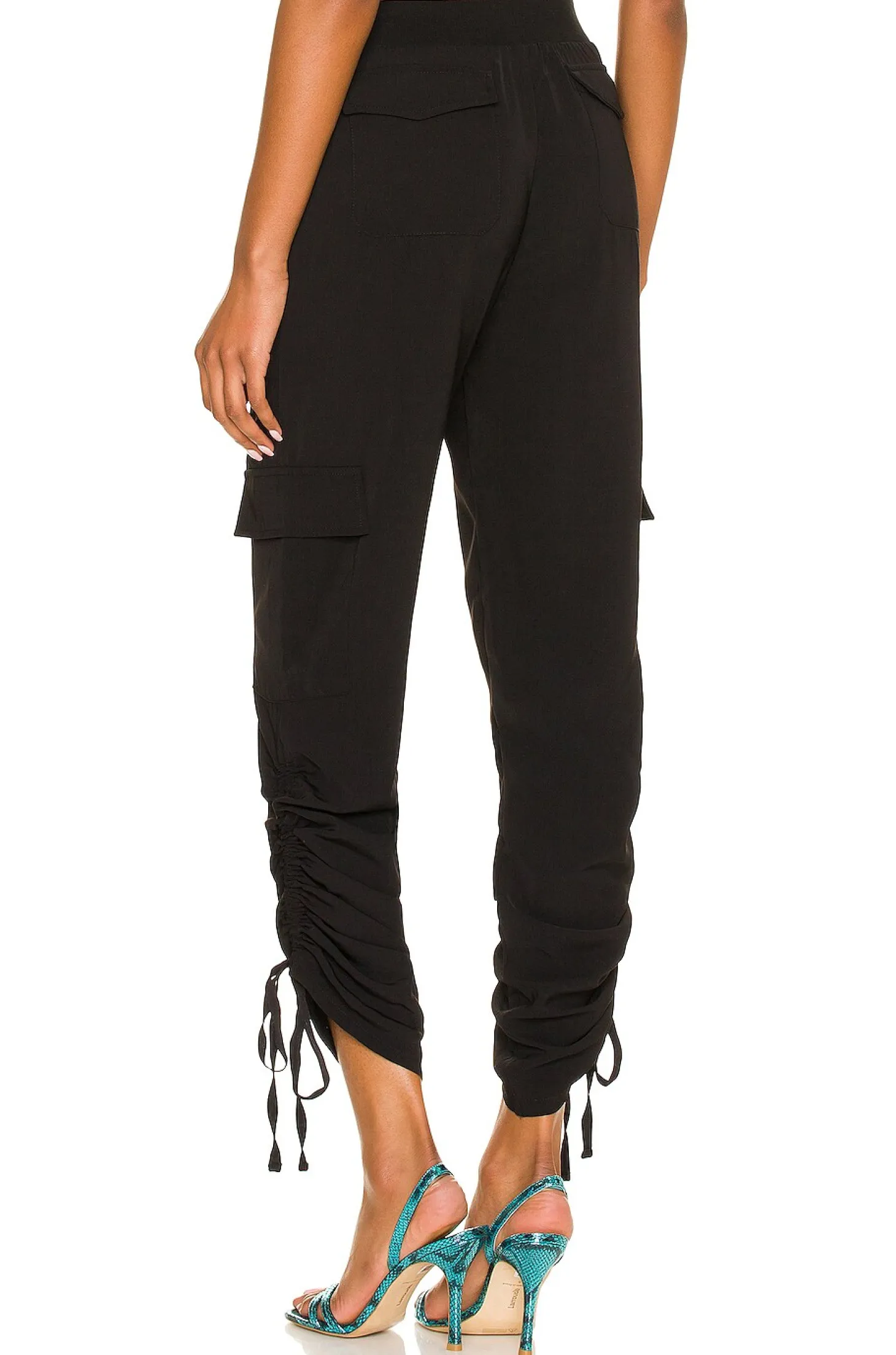 Self: 100% poly Contrast Fabric: 100% cotton.Made in China.Hand wash.Elastic waistband with drawstring closure.Side slant pockets, side cargo pockets and back flap pockets.Ruched drawstring sides at cuffs.16" at the knee narrows to 12" at the leg opening
