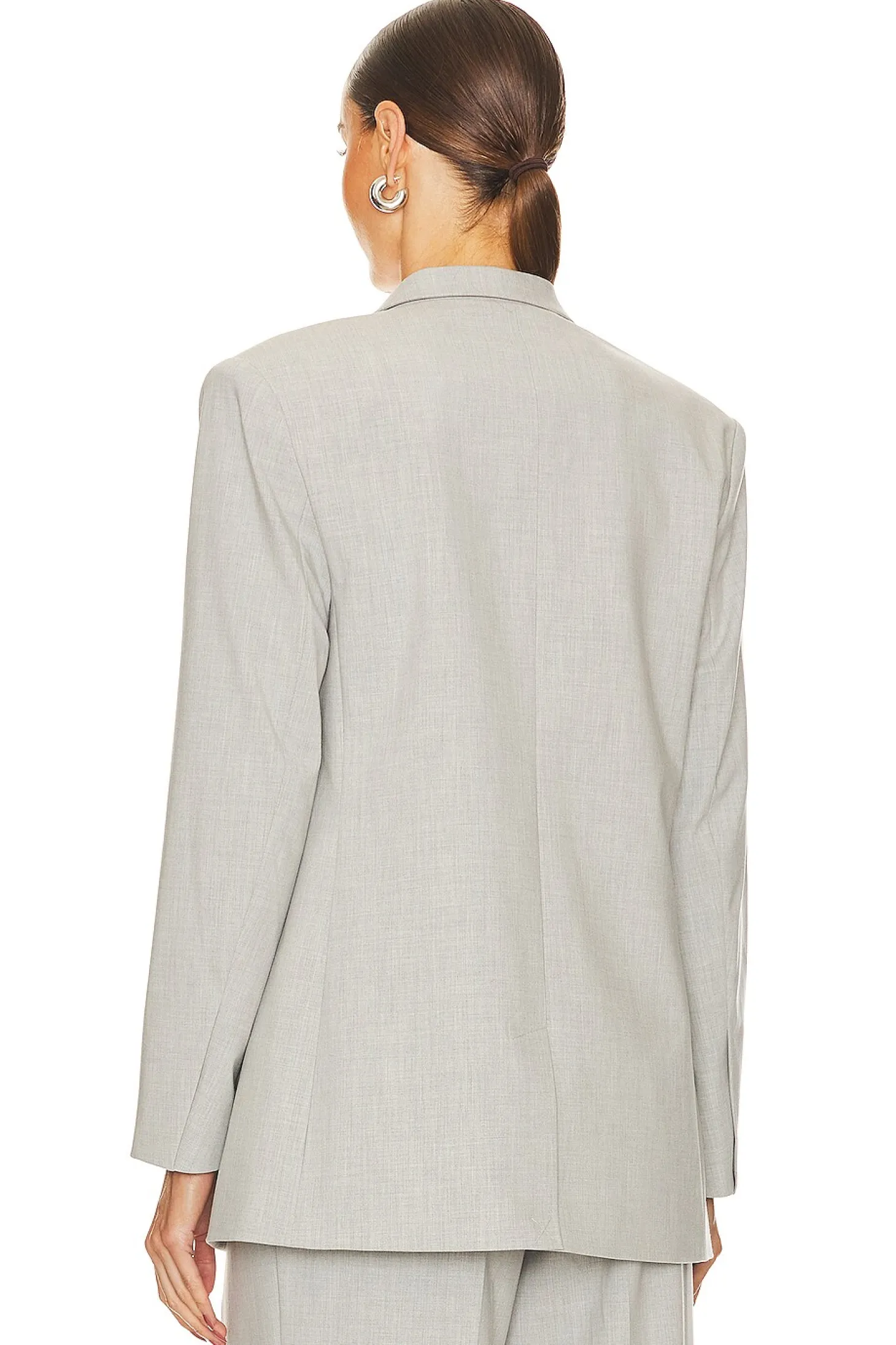 Self: 57% polyester 29% rayon 10% wool 4% spandex Lining: 55% polyester 45% viscose.Made in China.Dry clean only.Double breasted front button closure.Padded shoulders.Front slip pockets.Suiting fabric.Item not sold as a set