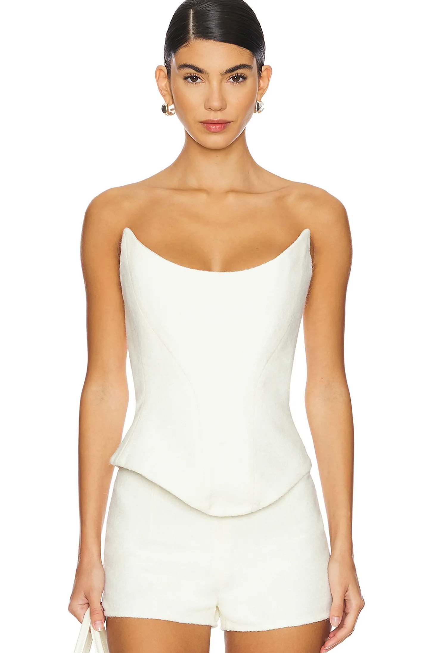 60% acrylic 25% polyester 10% polyamide 5% wool.Made in China.Dry clean only.Criss-cross velcro ring closure.Boned bodice Scoop neckline.Heavyweight crepe fabric with asymmetrical hem Item not sold as a set
