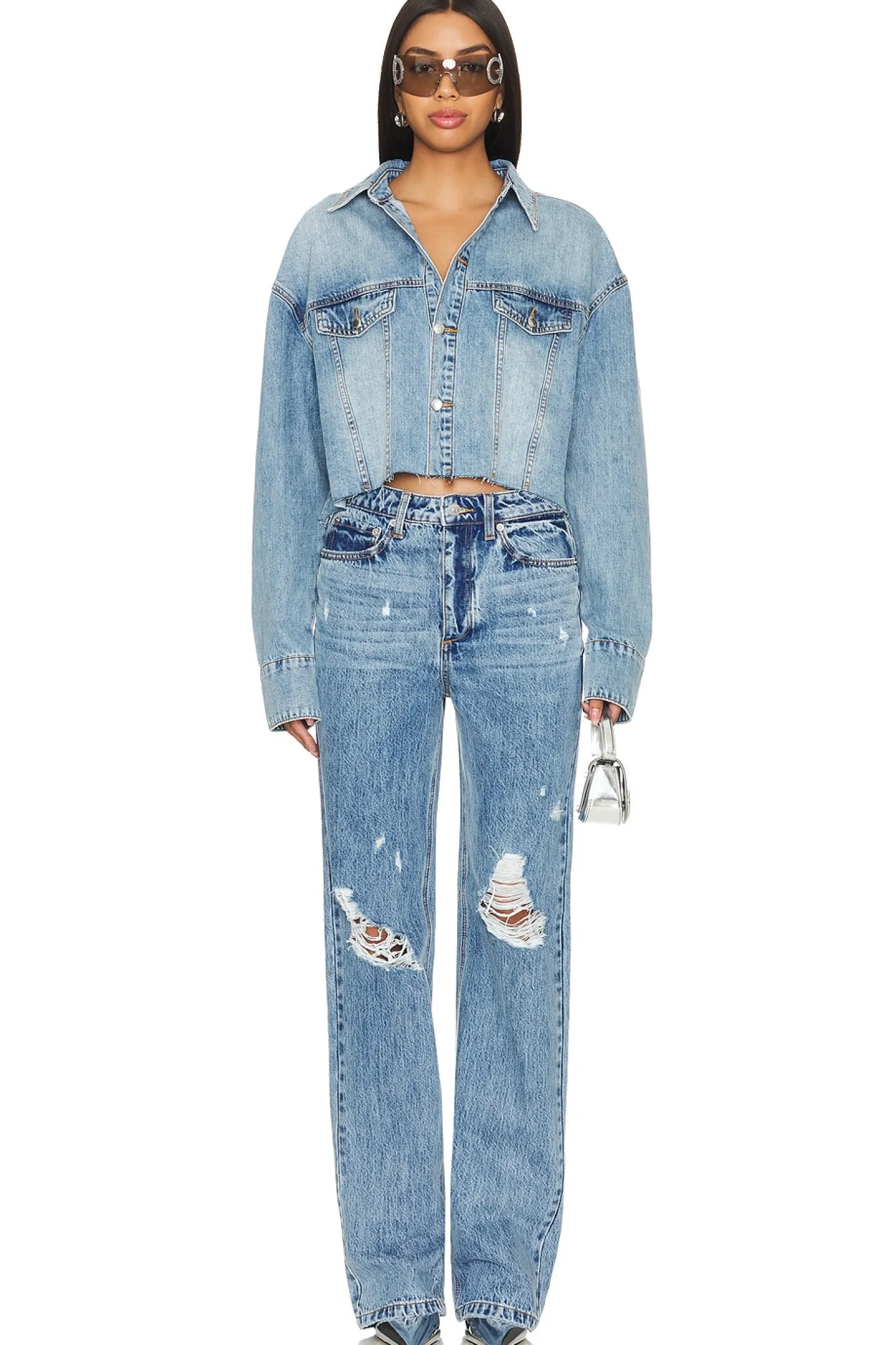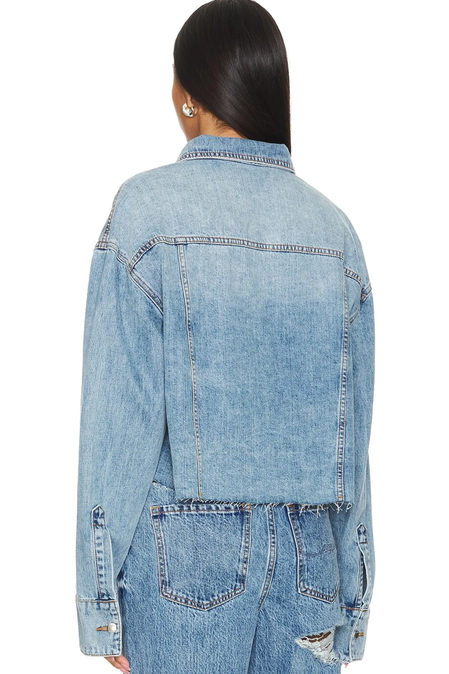 100% cotton.Made in China.Machine wash.Front button closure.Dual front pocket styling.Frayed hem detail
