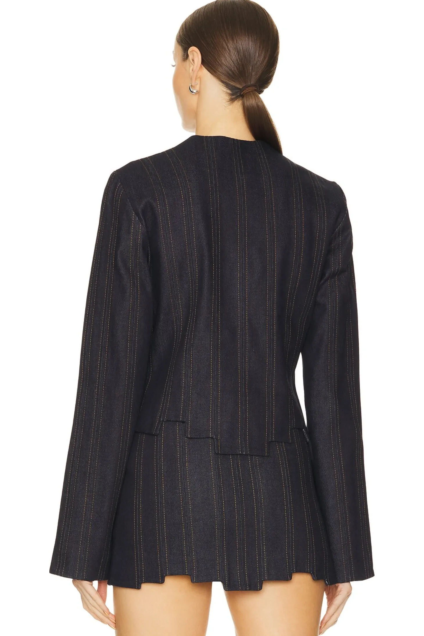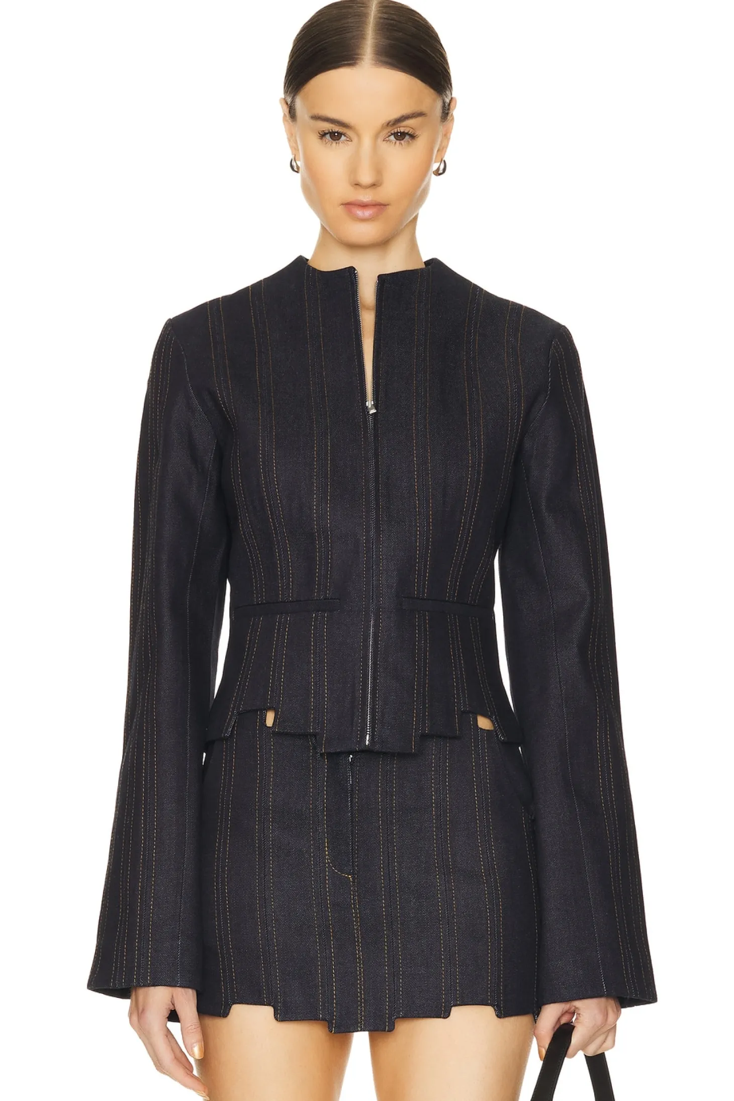 100% cotton.Made in USA.Dry clean only.Front zipper closure.Side welt pockets.Item not sold as set