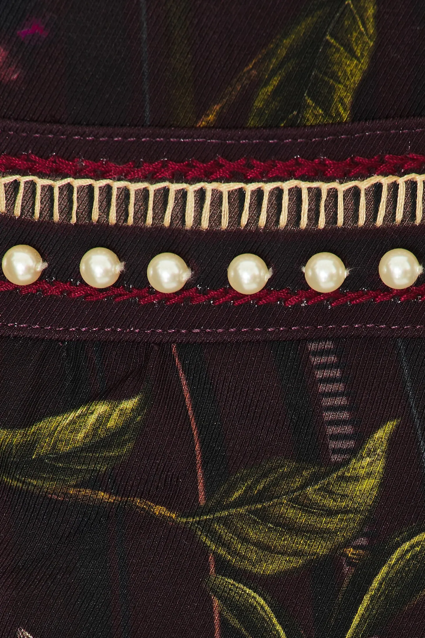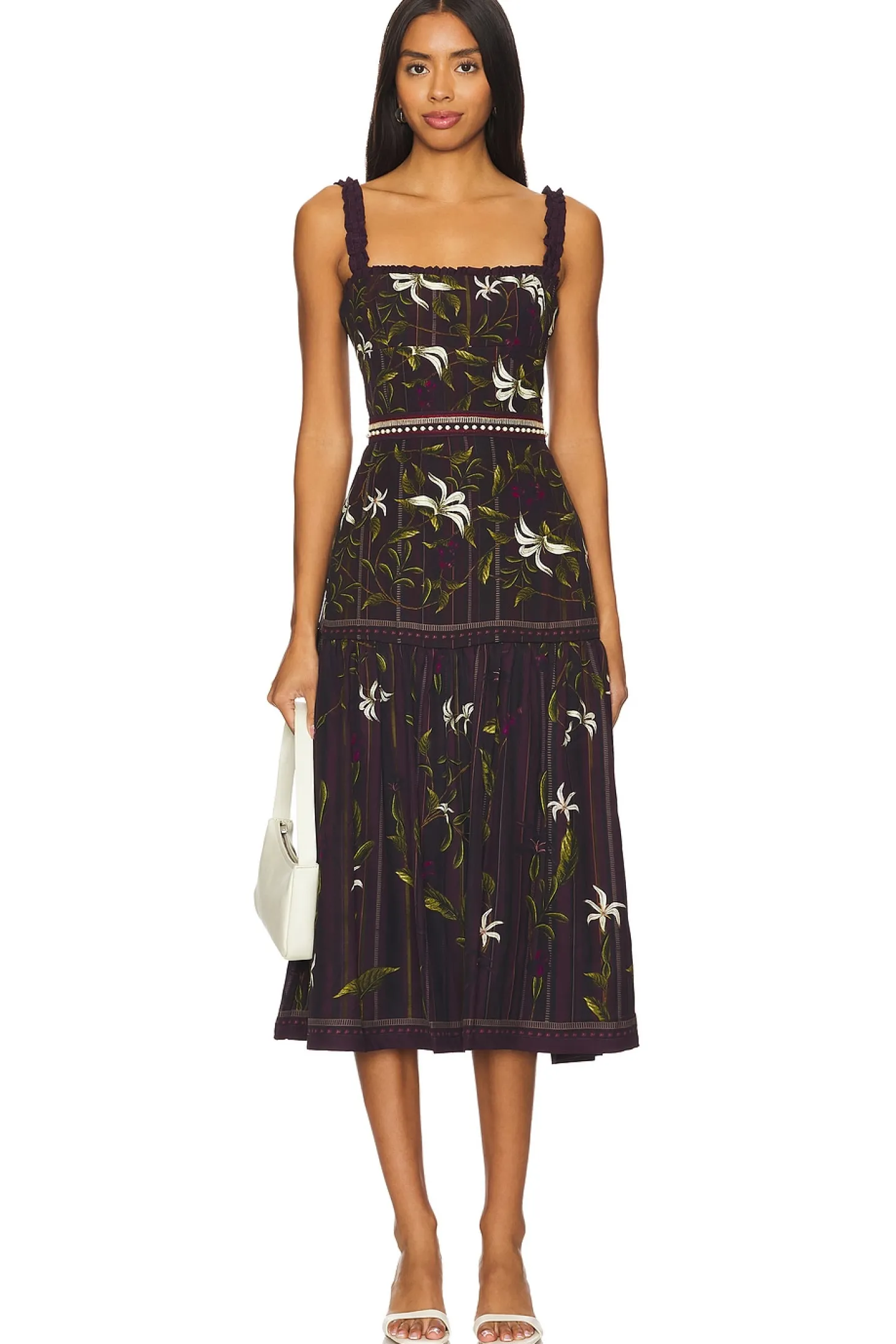 Self: 68% recycled viscose 32% viscose Lining: 100% cotton.Made in Colombia.Dry clean only.Fully lined.Hidden back zipper closure.Ruffle trim along neckline and shoulder straps.Faux pearl detail at waist Midweight twill fabric