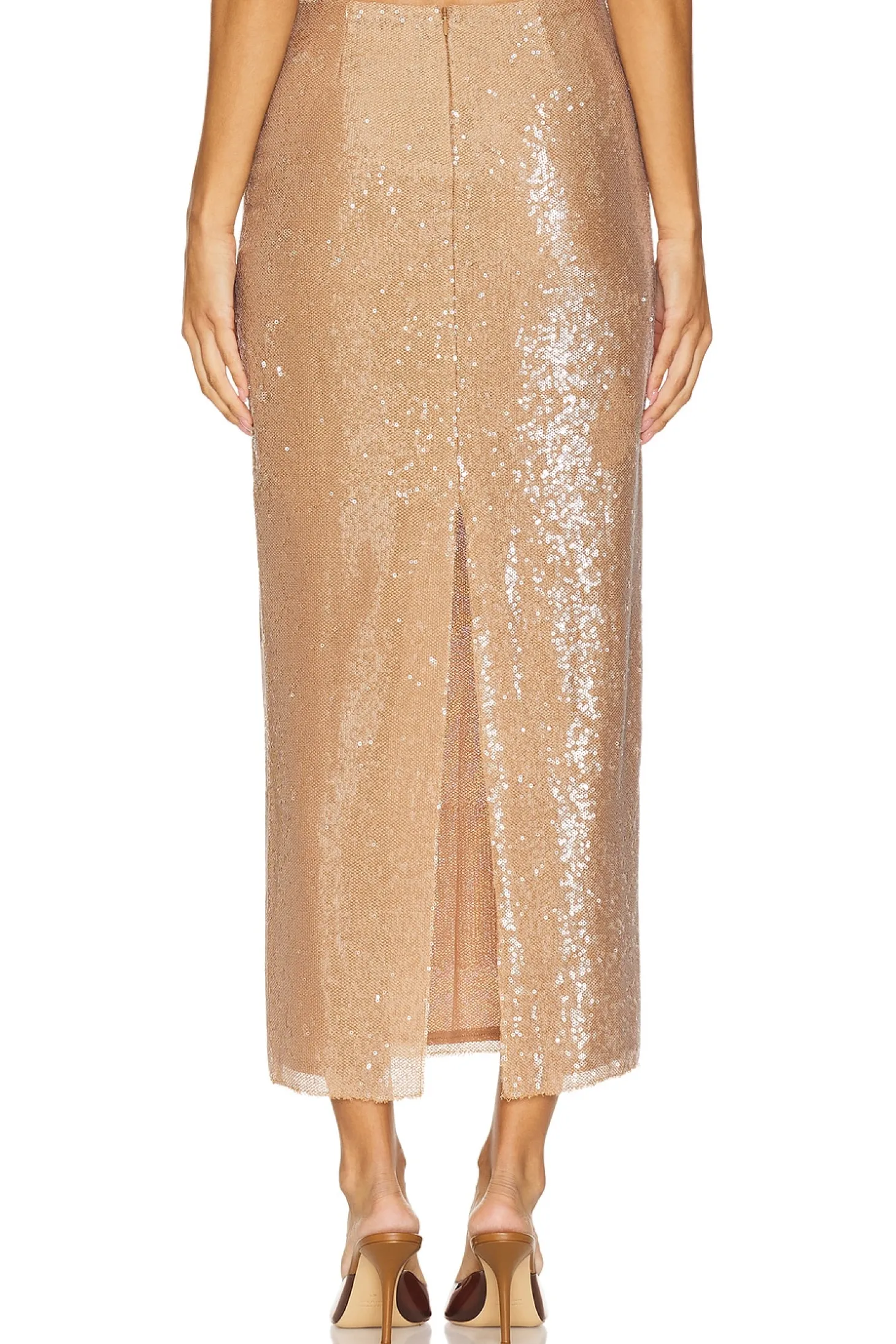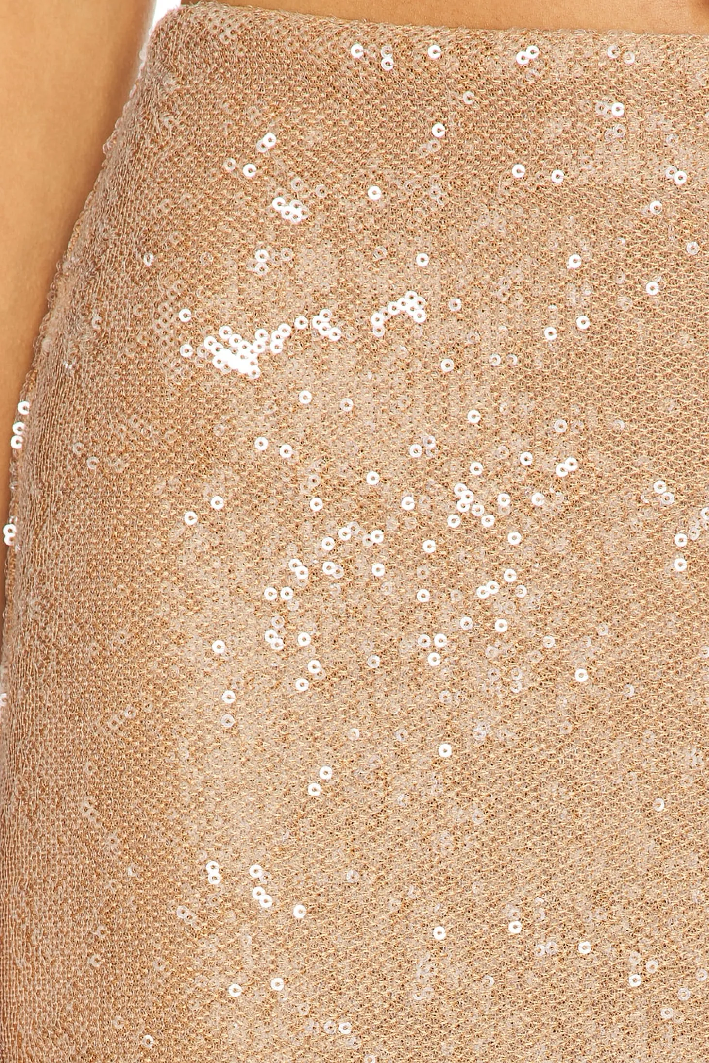 Self: 100% polyester Lining: 90% nylon 10% elastane.Made in China.Dry clean only.Fully lined.Hidden back zip closure.Sequin embellished fabric with back vent.Item not sold as set.Skirt measures approx 36.5" in length