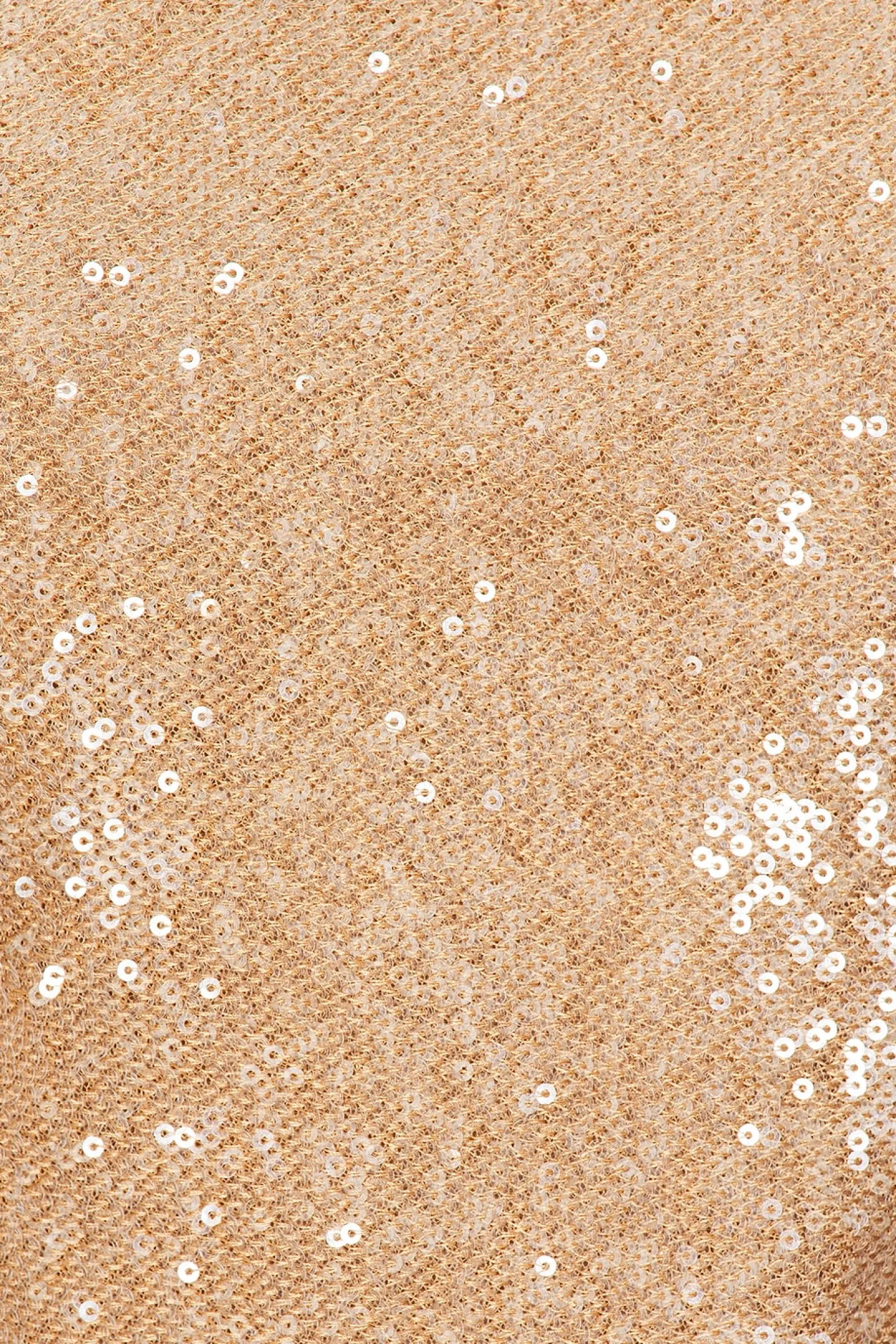 100% polyester.Made in China.Dry clean only.Open back with halterneck and back tie closure.Sequin embellished fabric with back vent.Item not sold as set.Garment is made with a semi-sheer fabric, undergarments can show through