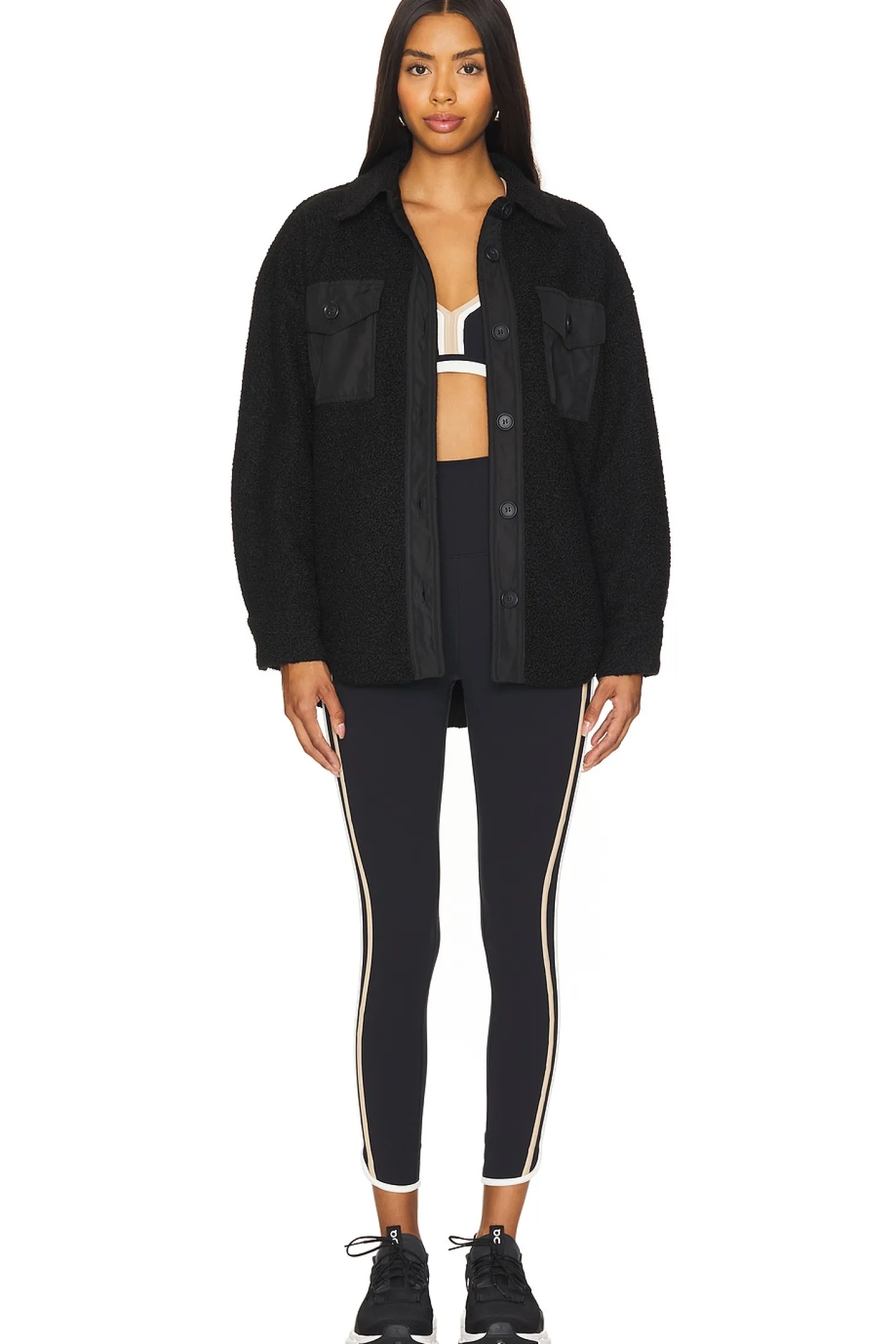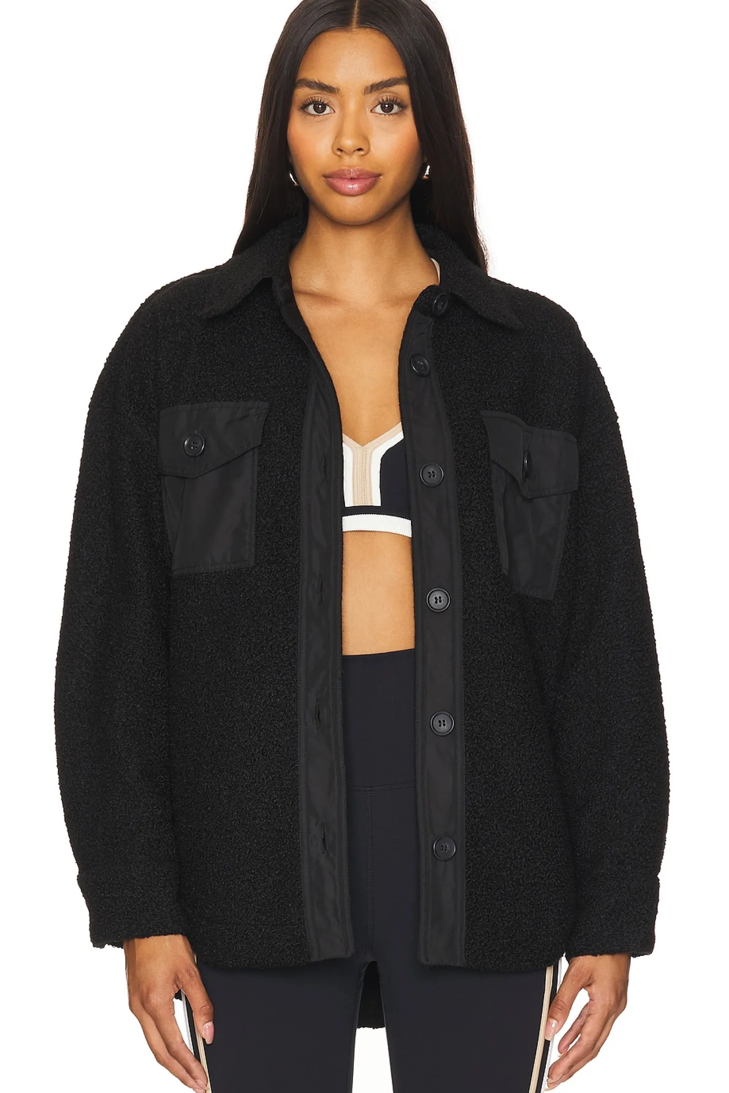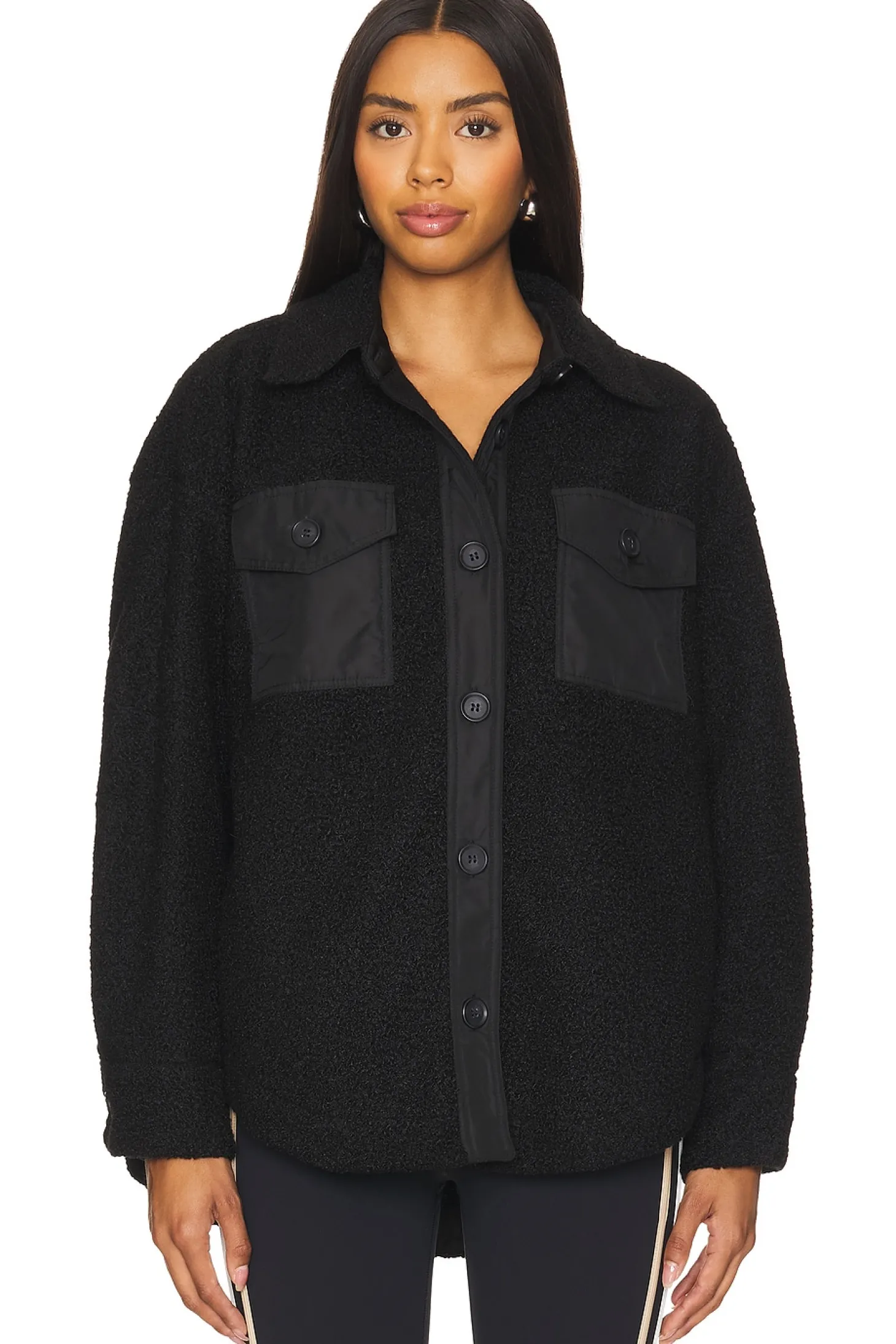 100% polyester.Made in China.Hand wash.Front button closure.4-pocket design.Button cuffs.Bouclé knit fabric with ripstop panels