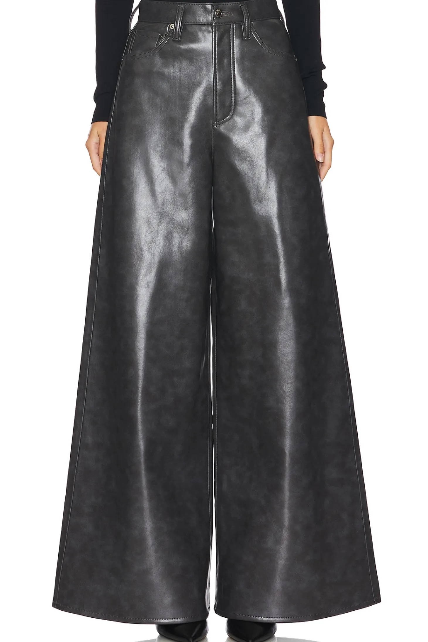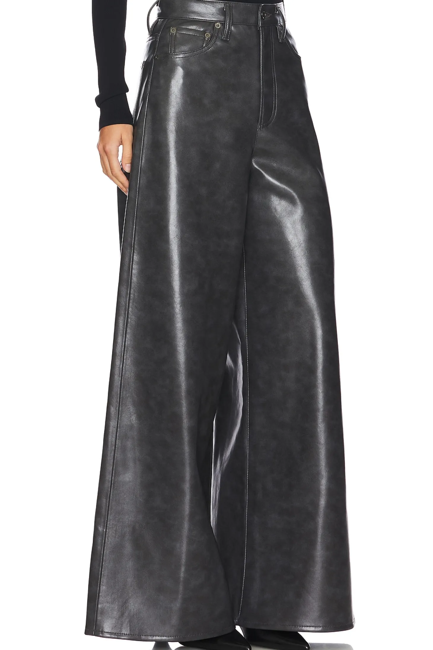 50% recycled leather fiber 30% polyurethane 20% polyester.Made in USA.Dry clean only.Fly zip with button closure.5-pocket styling.Midweight faux leather fabric.25" at the knee breaks to 30" at the leg opening