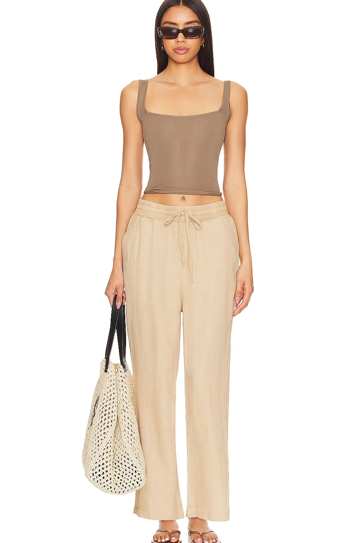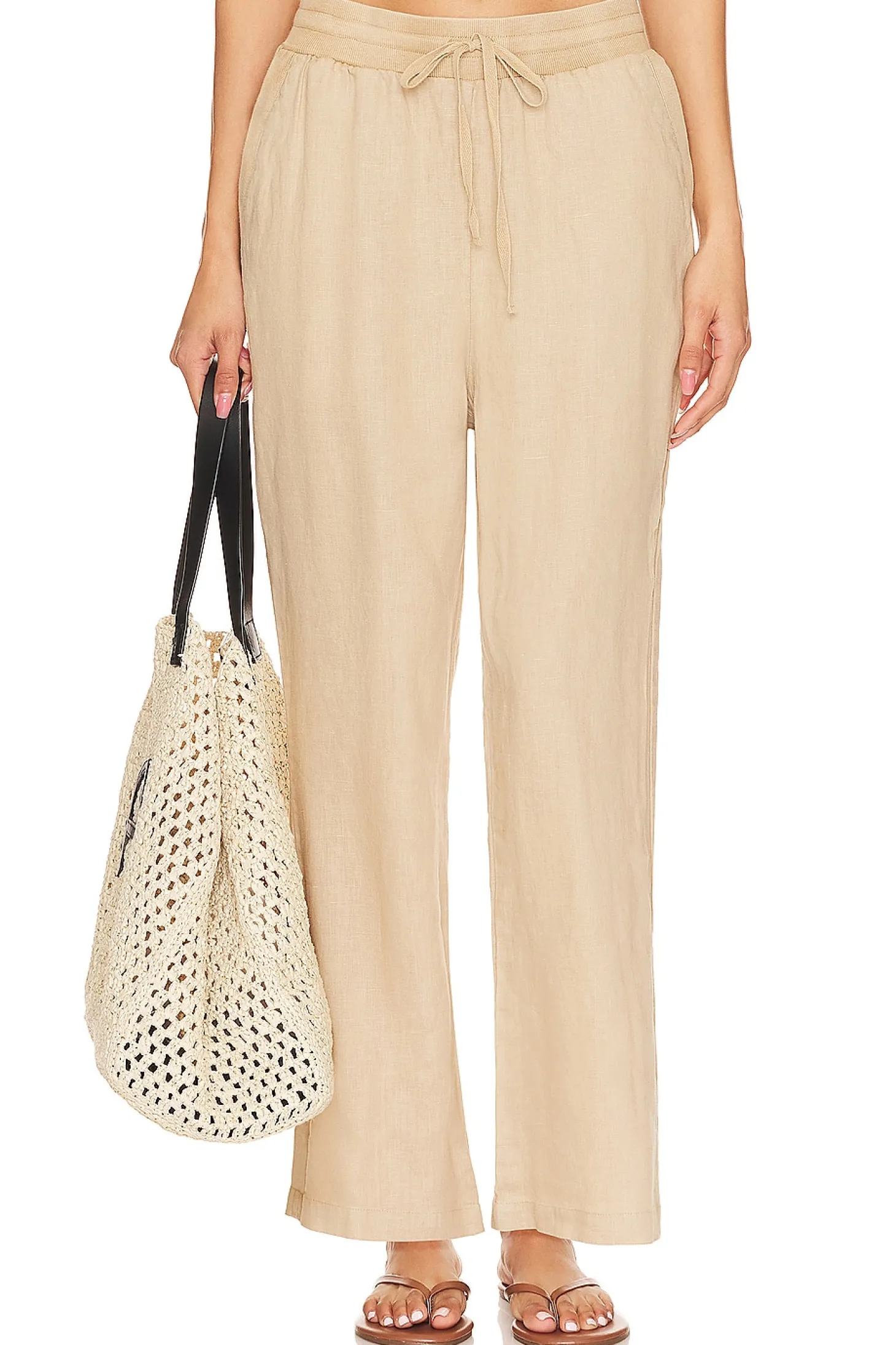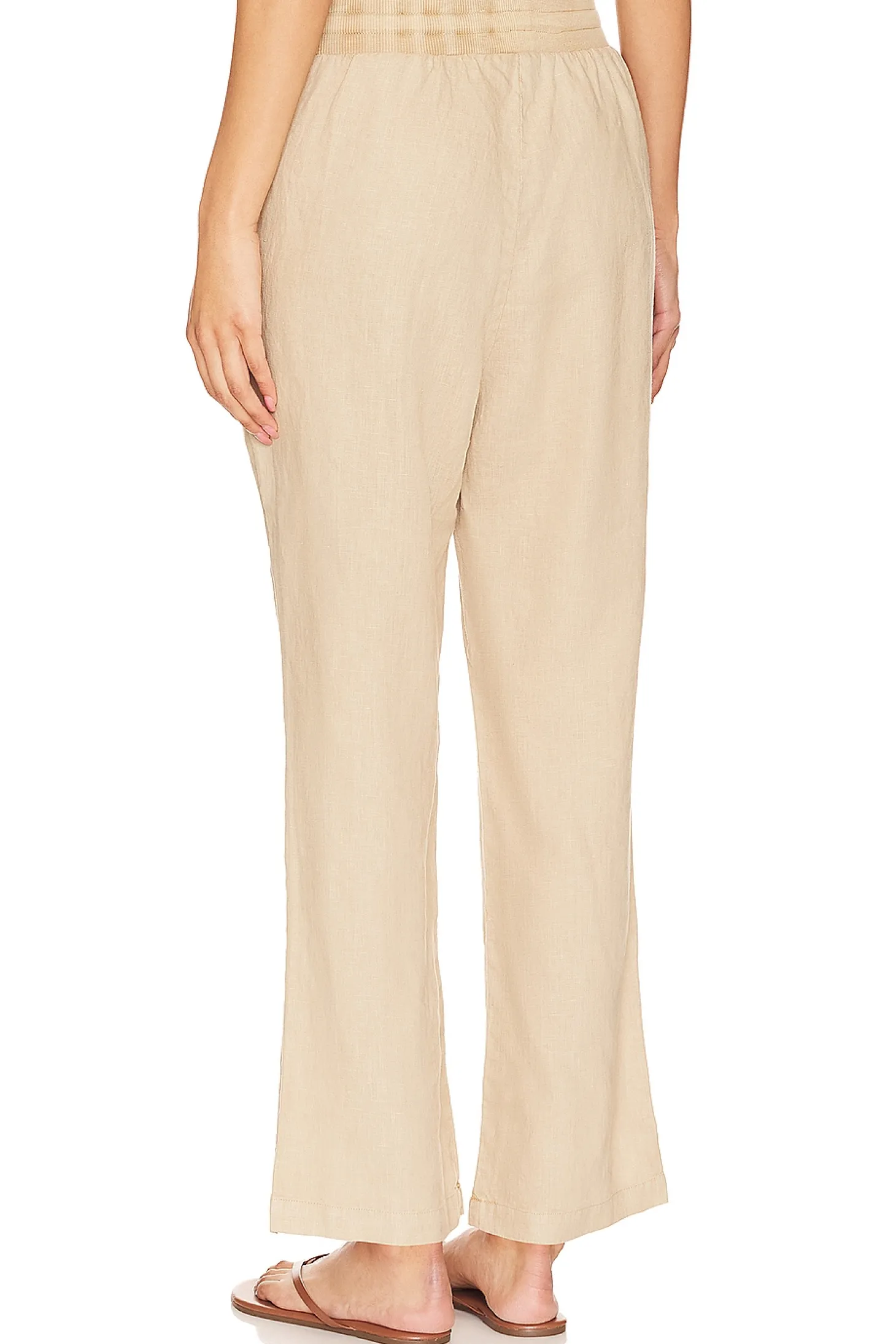 Self: 100% linen Lining: 97% cotton 3% spandex.Made in China.Machine wash.Elastic drawstring waist tie closure.Side slant pockets.Linen fabric.18" at the knee narrows to 17.5" at the leg opening Size S waist circumference measures approx 30"