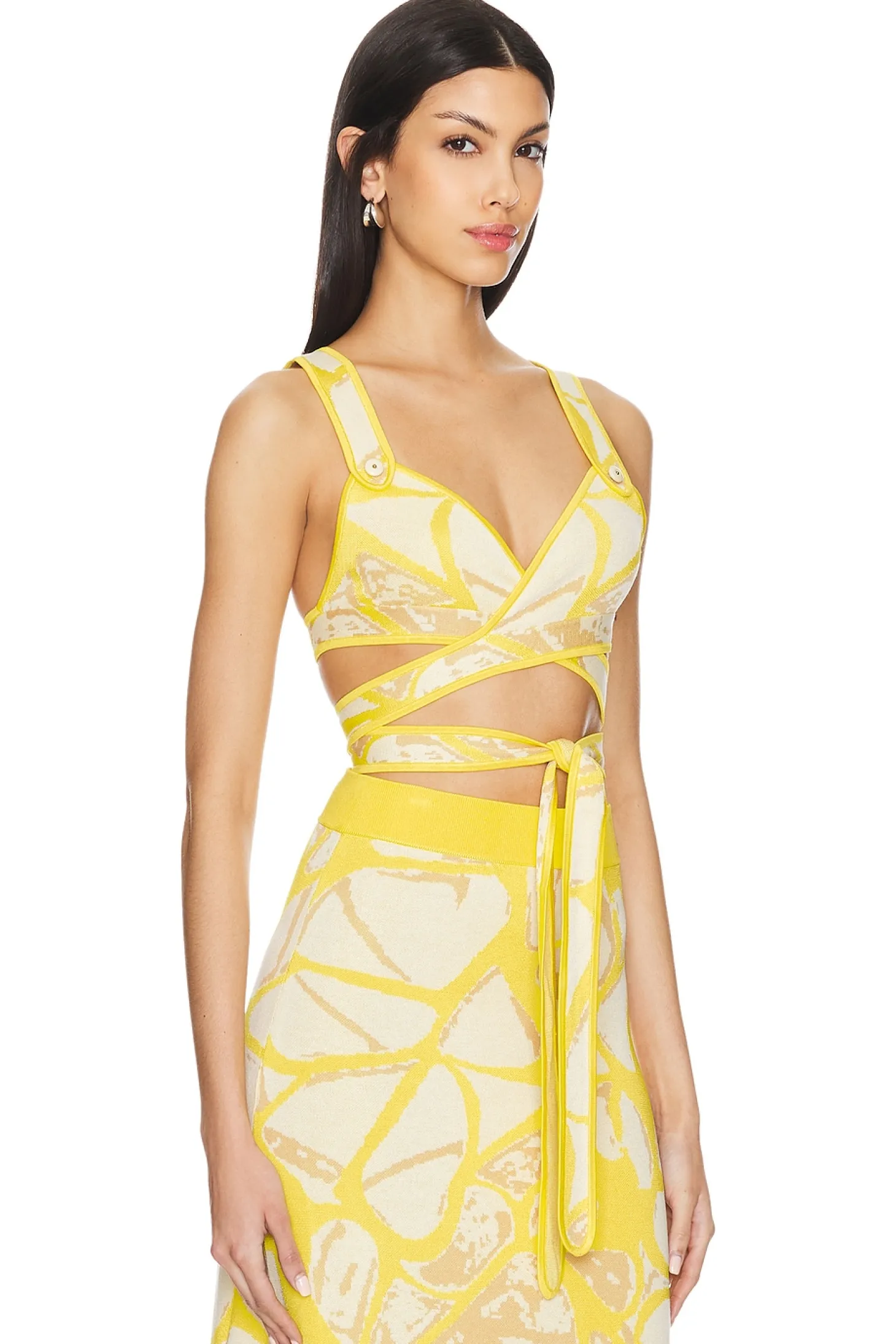 59% rayon 33% viscose 8% nylon.Made in China.Dry clean only.Wrap styling with wrap around tie closure.Item not sold as a set