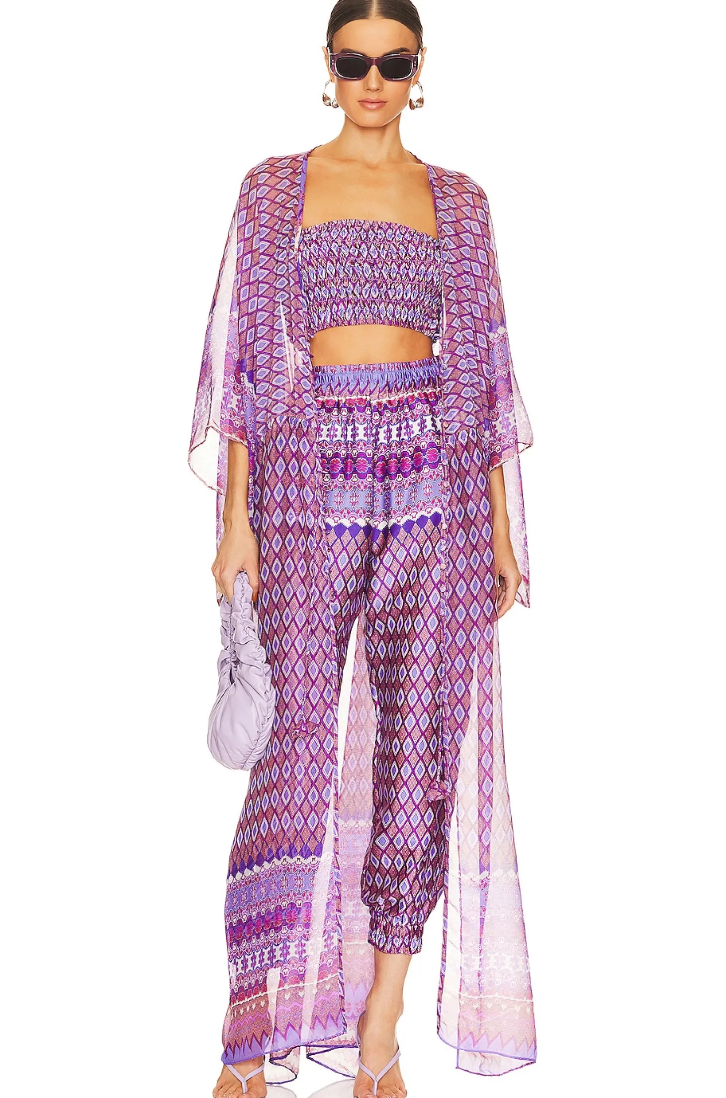 100% polyester.Made in USA.Dry clean only.Pull-on styling with smocked elastic waistband.Side seam pockets.Cinched cuffs.Lightweight satin fabric Item not sold as set.18" at the knee narrows to 8" at the leg opening