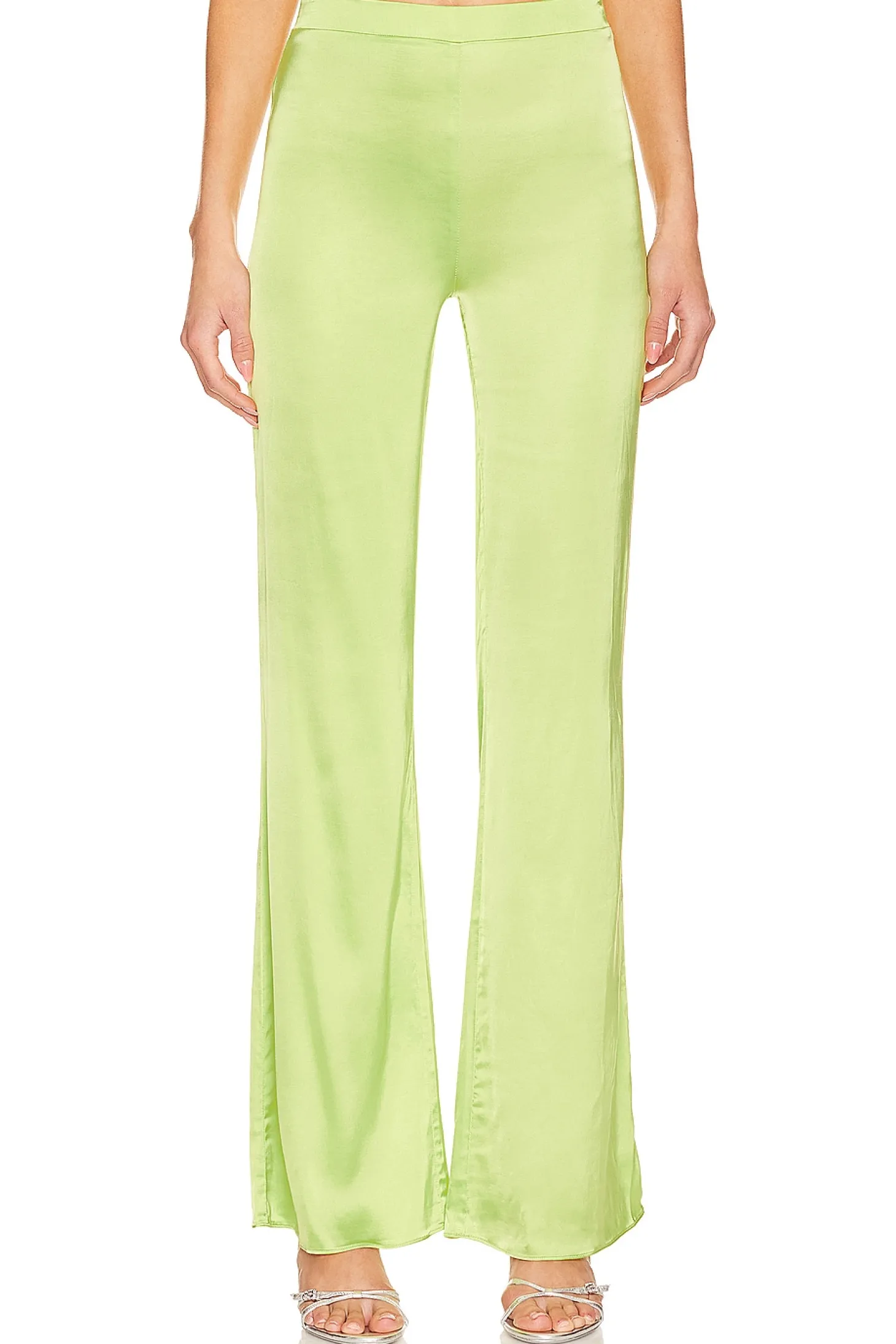 53% viscose 44% rayon 3% elastane.Made in China.Hand wash.Hidden back zipper closure.Satin fabric.Item not sold as a set.16" at the knee breaks to 20" at the leg opening