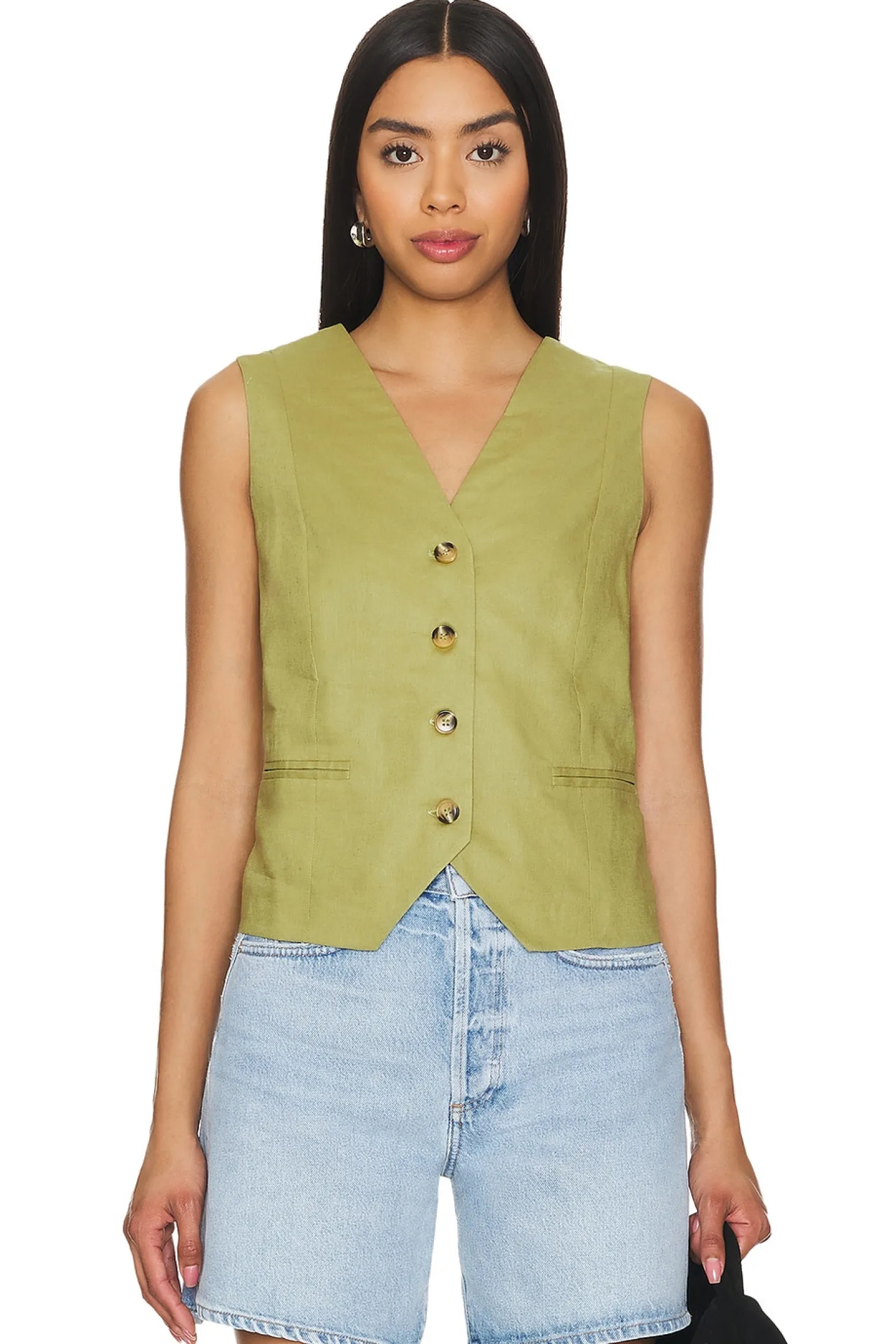Self: 45% cotton 55% linen Lining 100% cotton.Made in China.Hand wash.Front button closure.Front slip pockets