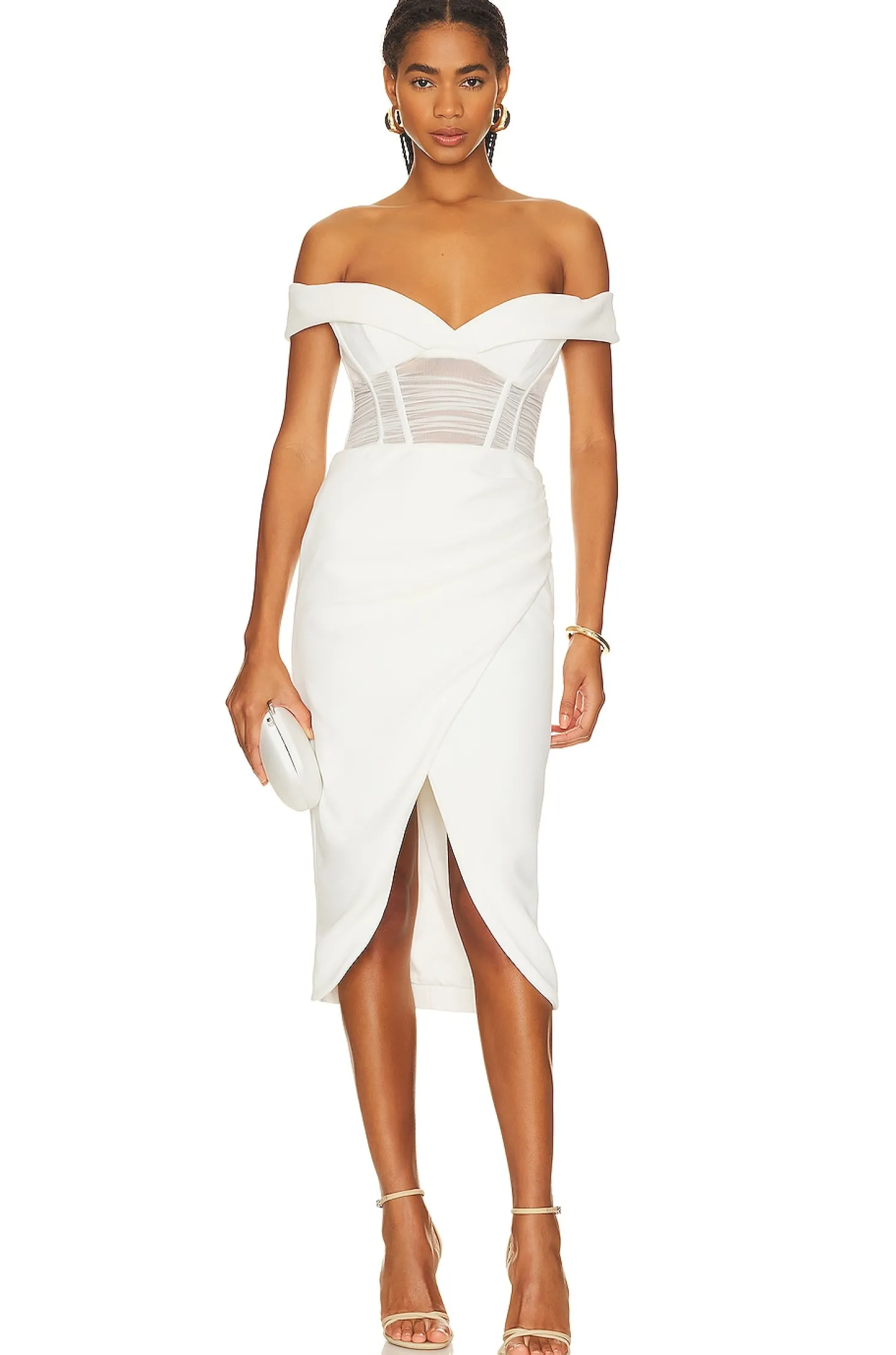Self: 100% polyester Contrast Fabric: 92% nylon 8% elastane Lining: 95% polyester 5% elastane.Made in China.Dry clean recommended.Unlined.Exposed back zipper closure.Off the shoulder styling.Midweight crepe fabric with mesh paneling at bodice