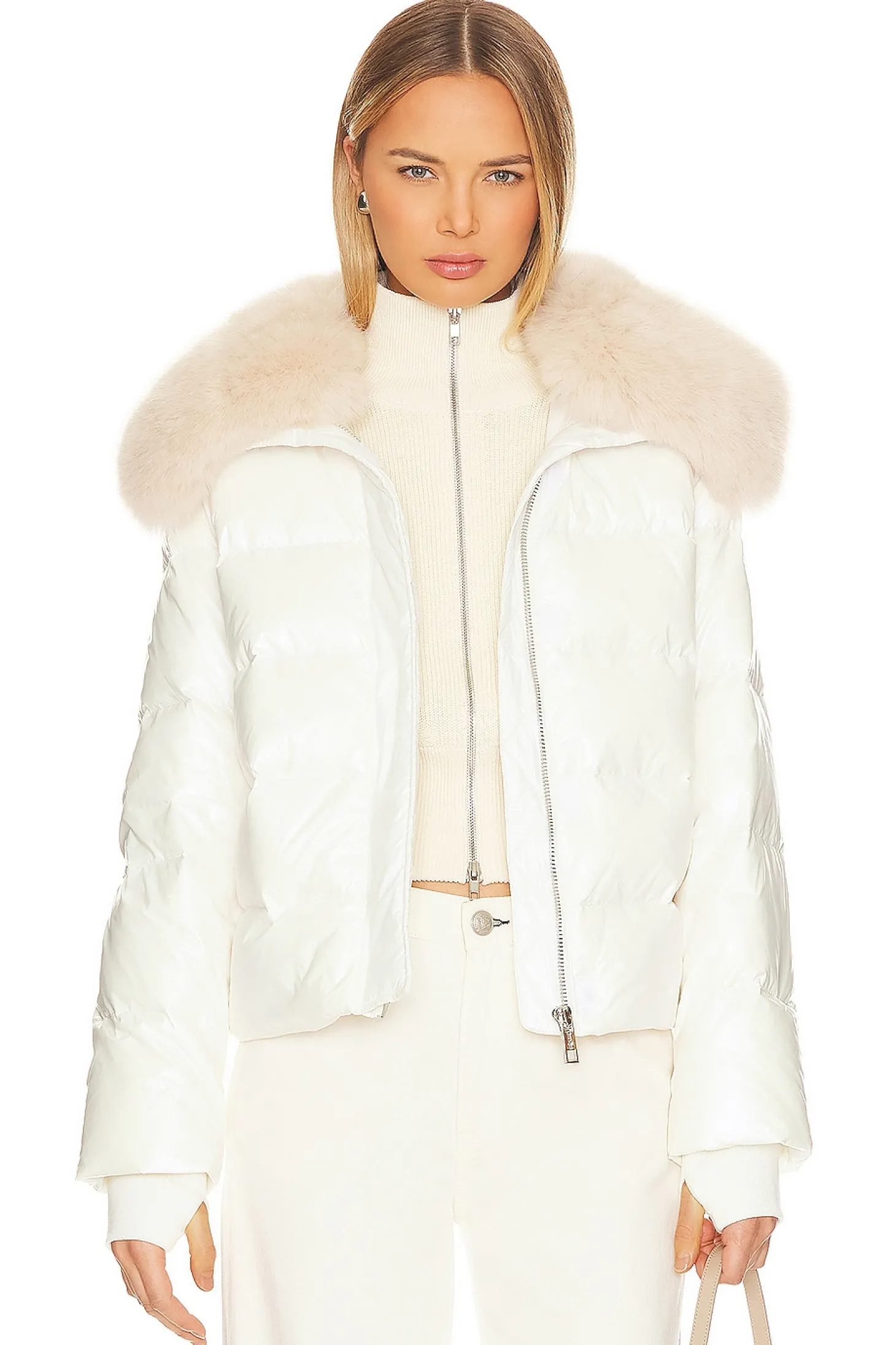 Self 1: 100% polyester Self 2: 100% nylon Fill: 90% goose down 10% goose feather Lining: 100% polyester Knit: 100% acrylic.Made in China.Dry clean only.Front zipper closure with velcro detail.Detachable faux fur collar.Side slant pockets.Ribbed cuffs with thumbhole design.Interior drawcord closure Ripstop fabric