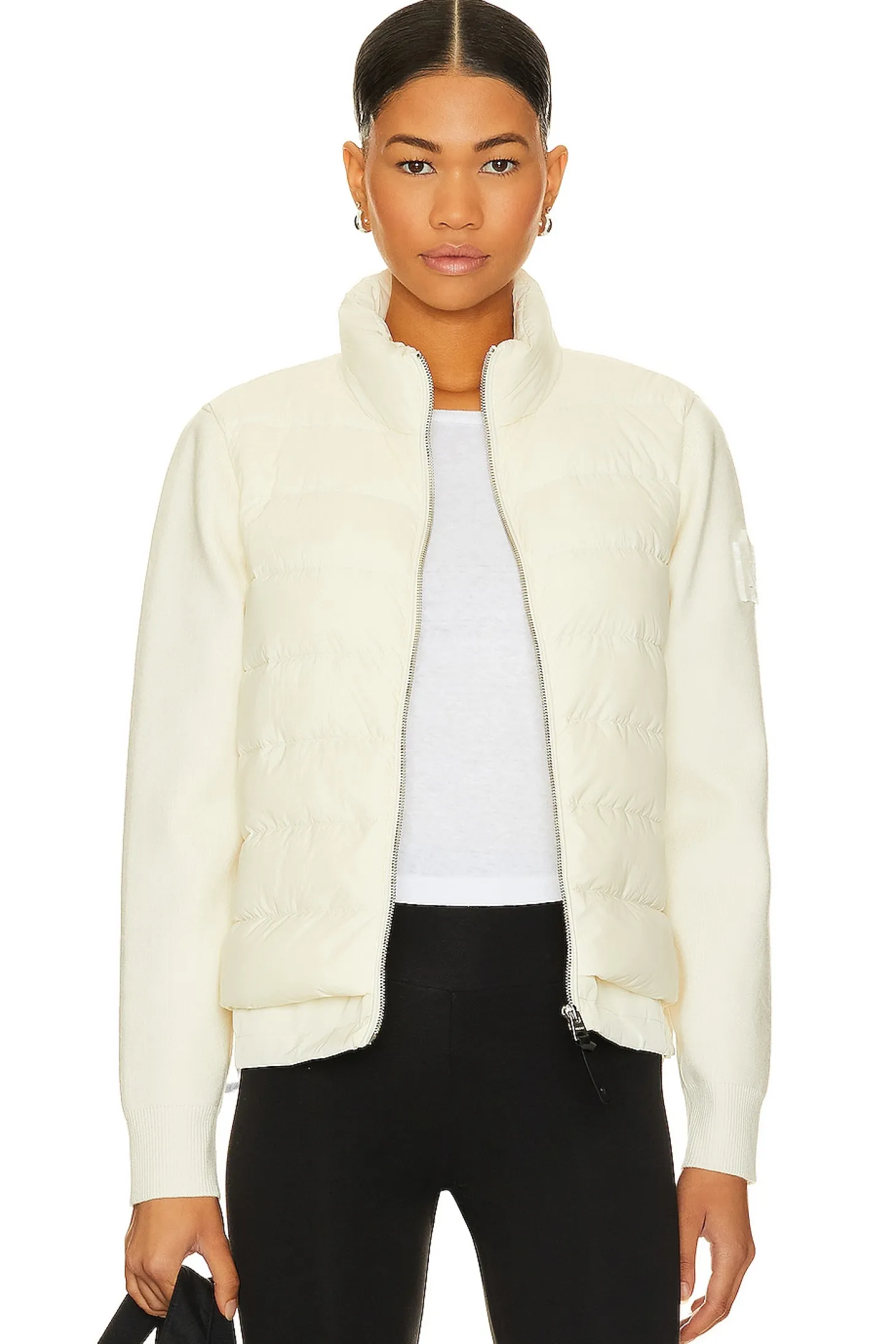 Self: 100% nylon Contrast Fabric: 100% recycled polyester Fill: 90% duck down 10% feathers Sleeves: 42% wool 42% acrylic 14% polyester 2% spandex.Made in China.Dry clean only.Exposed front zipper closure.Side zipper pockets.Puffer style challis fabric with ribbed knit sleeves