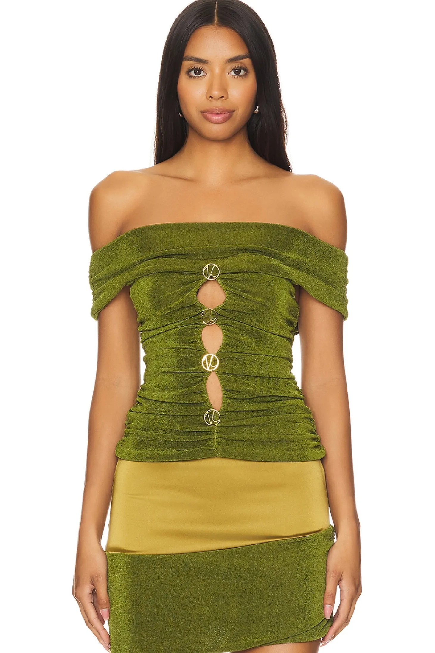 Slinky fabric.Imported.Dry clean recommended.Front cut-outs with gold-tone hardware.Ruched detail.Item not sold as a set