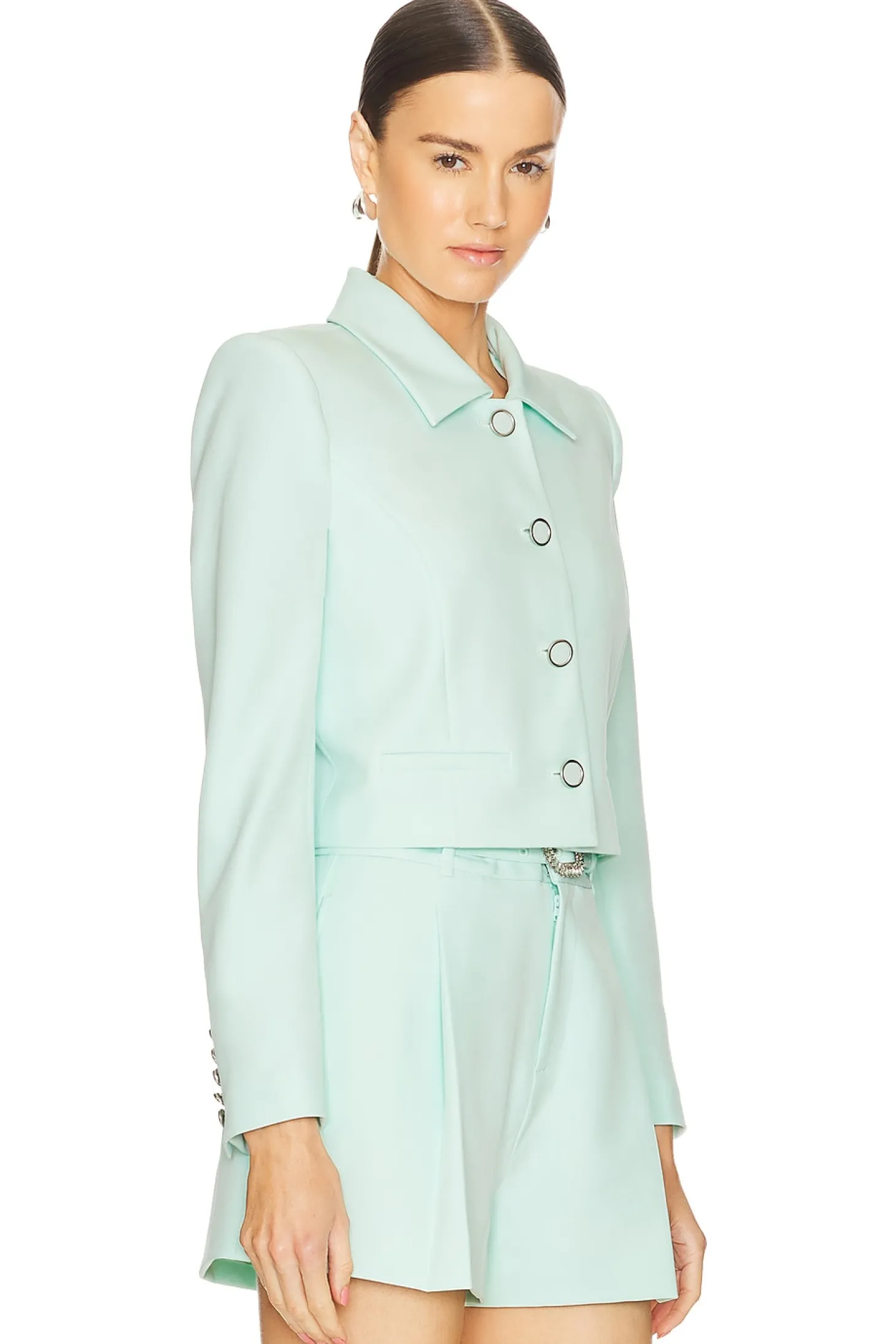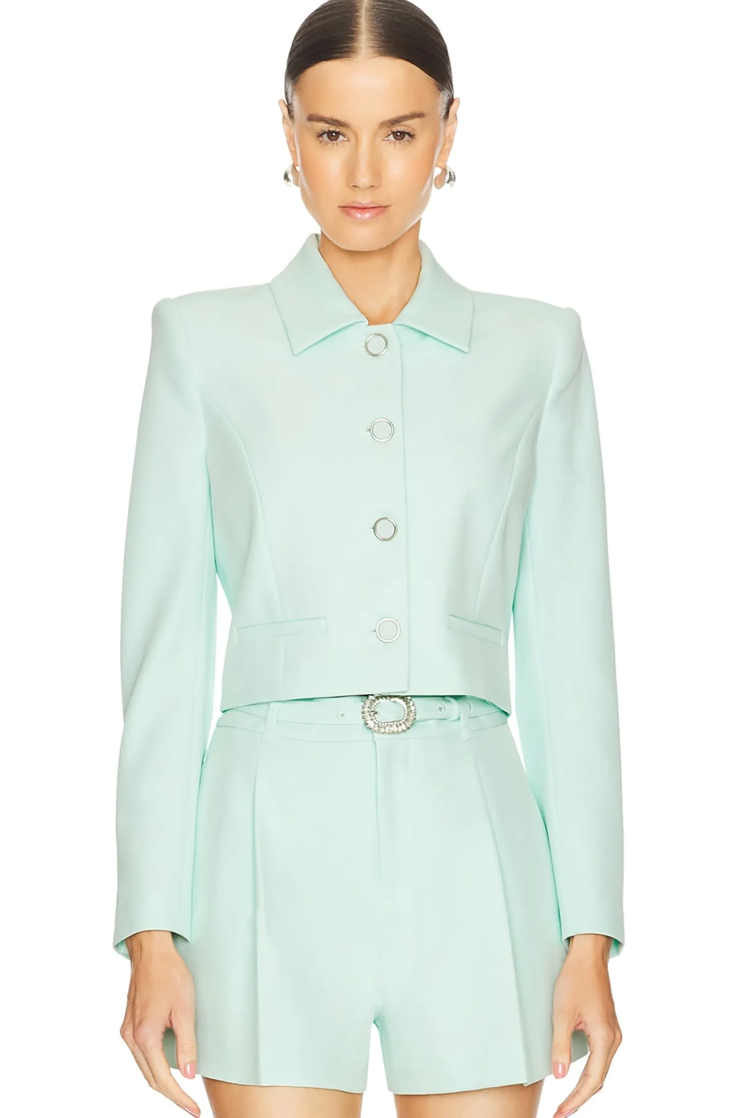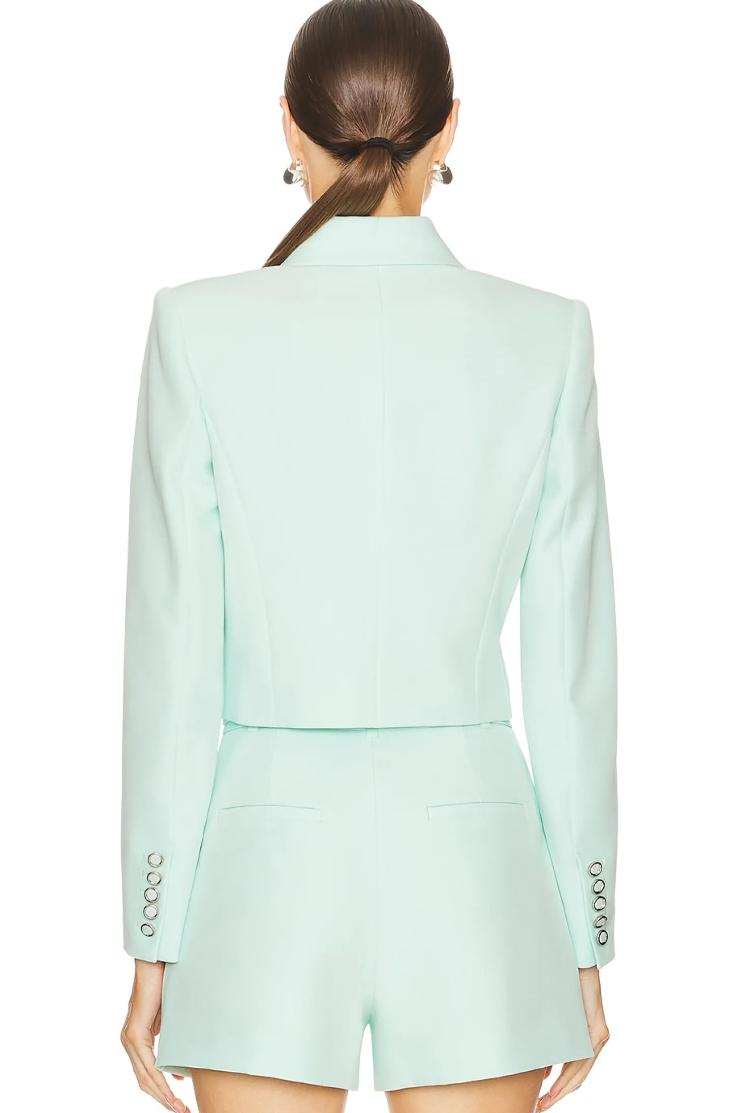 95% polyester 5% elastane.Made in China.Dry clean only.Front button closure.Padded shoulders.Button cuffs.Front welt pockets.Midweight crepe fabric Item not sold as a set