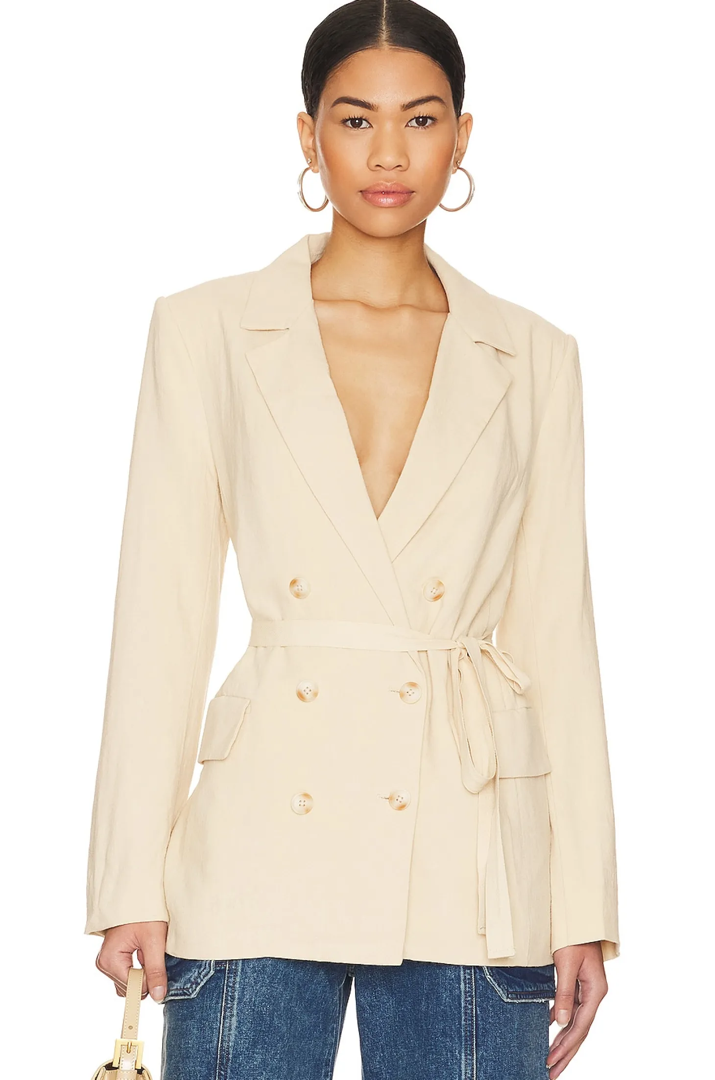 Self: 53% linen 47% viscose Lining: 100% viscose.Made in China.Dry clean only.Front button closure.Padded shoulders.Detachable waist tie.Front faux flap pockets.Buttoned cuffs