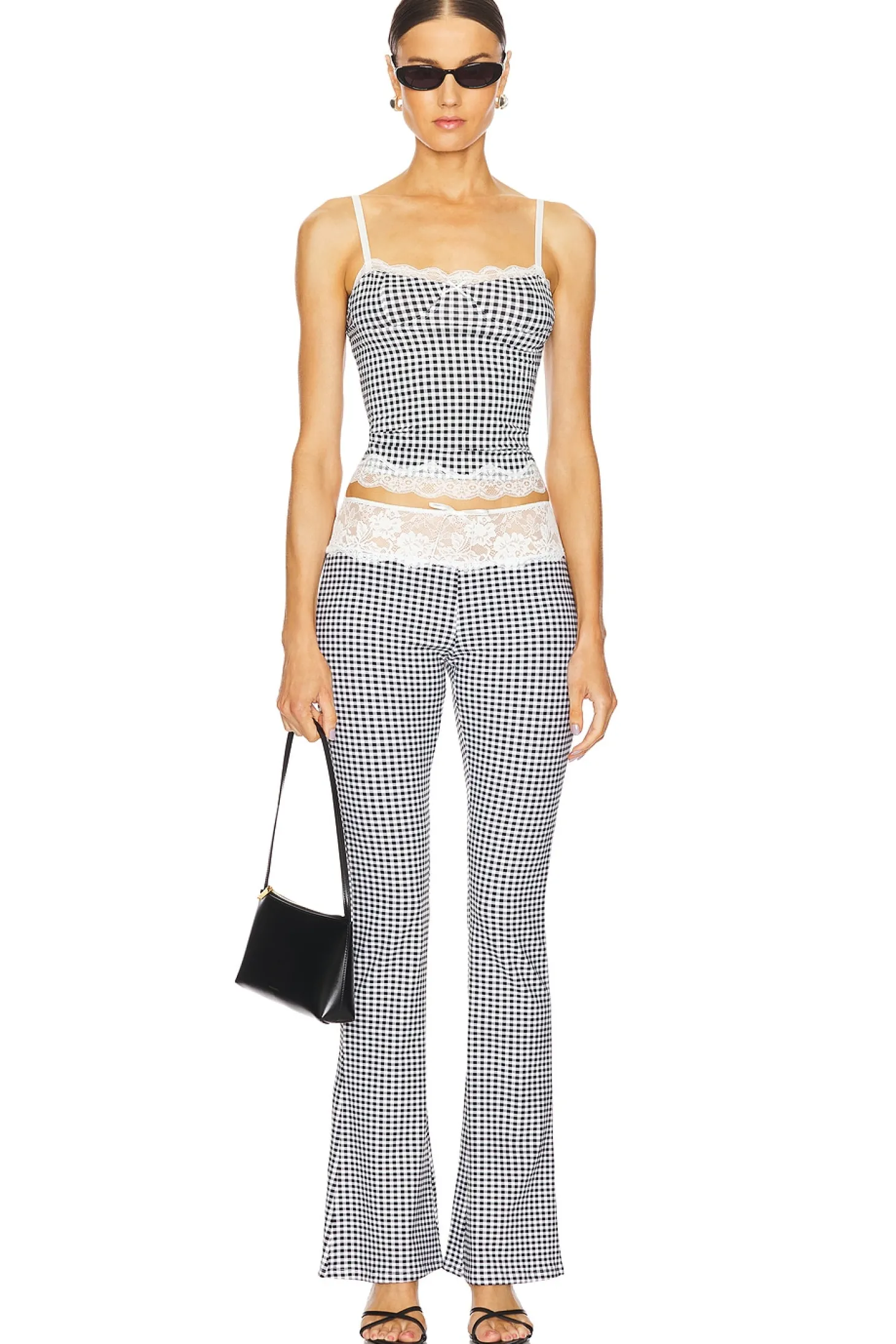 86% nylon 14% elastane.Made in China.Hand wash.Pull-on styling.Elasticized lace waistband with bow accent.Midweight jersey fabric Item not sold as a set.12" at the knee breaks to 18" at the leg opening