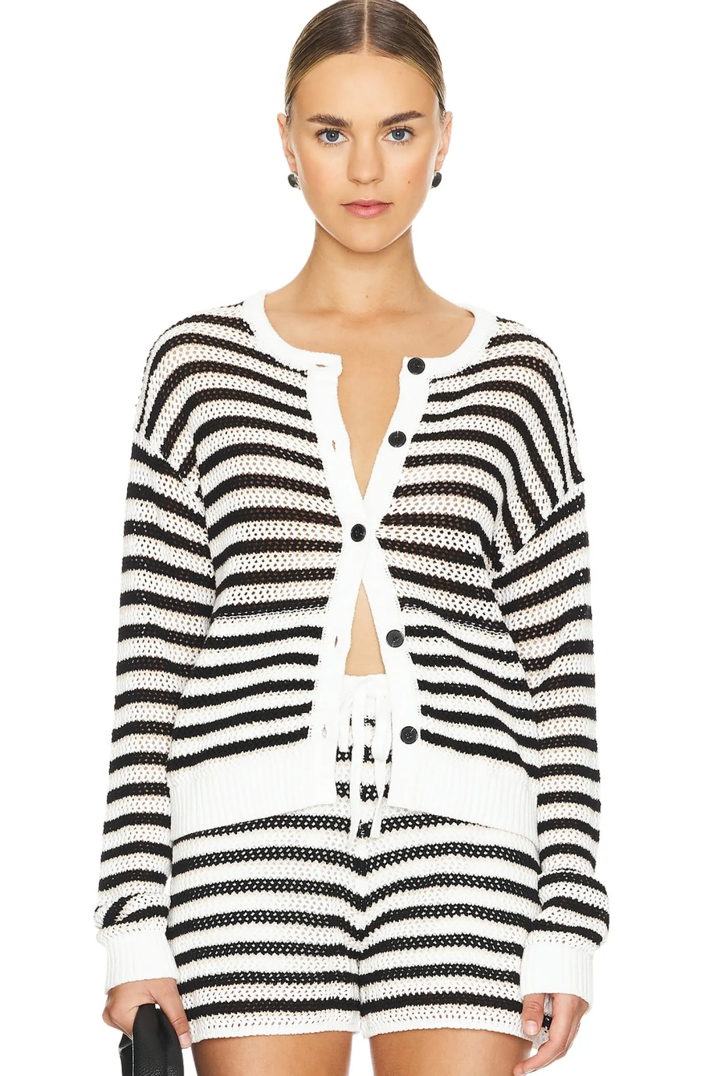 60% recycled cotton 40% cotton.Made in China.Hand wash cold.Front button closure