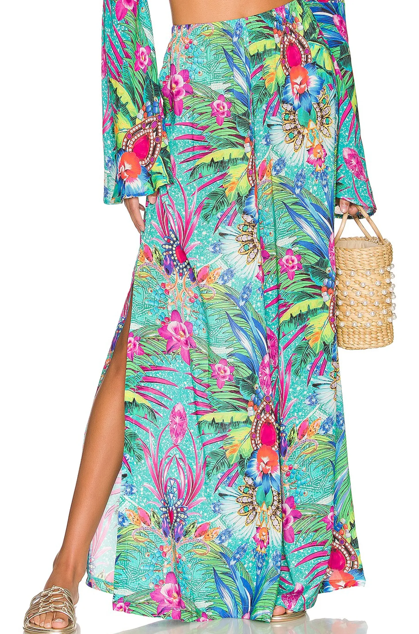 100% viscose.Made in Colombia.Hand wash.Elastic waistband.Side slant pockets.Split sides.Item not sold as a set.22" at the knee breaks to 40" at the leg opening