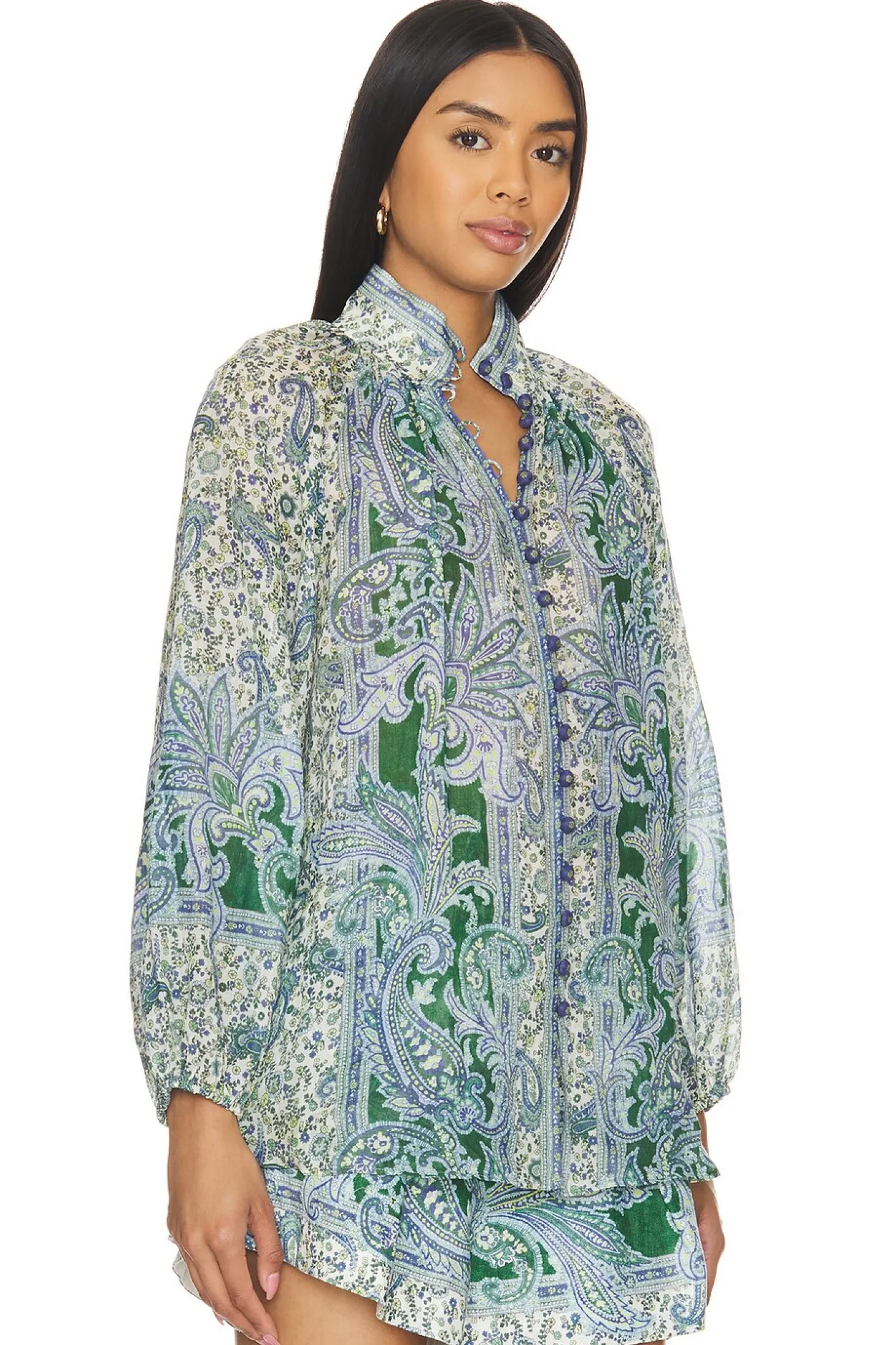 100% ramie.Made in Vietnam.Dry clean only.Front loop button closure.Blouson sleeves with cinched cuffs.Lightweight linen fabric.Item not sold as a set