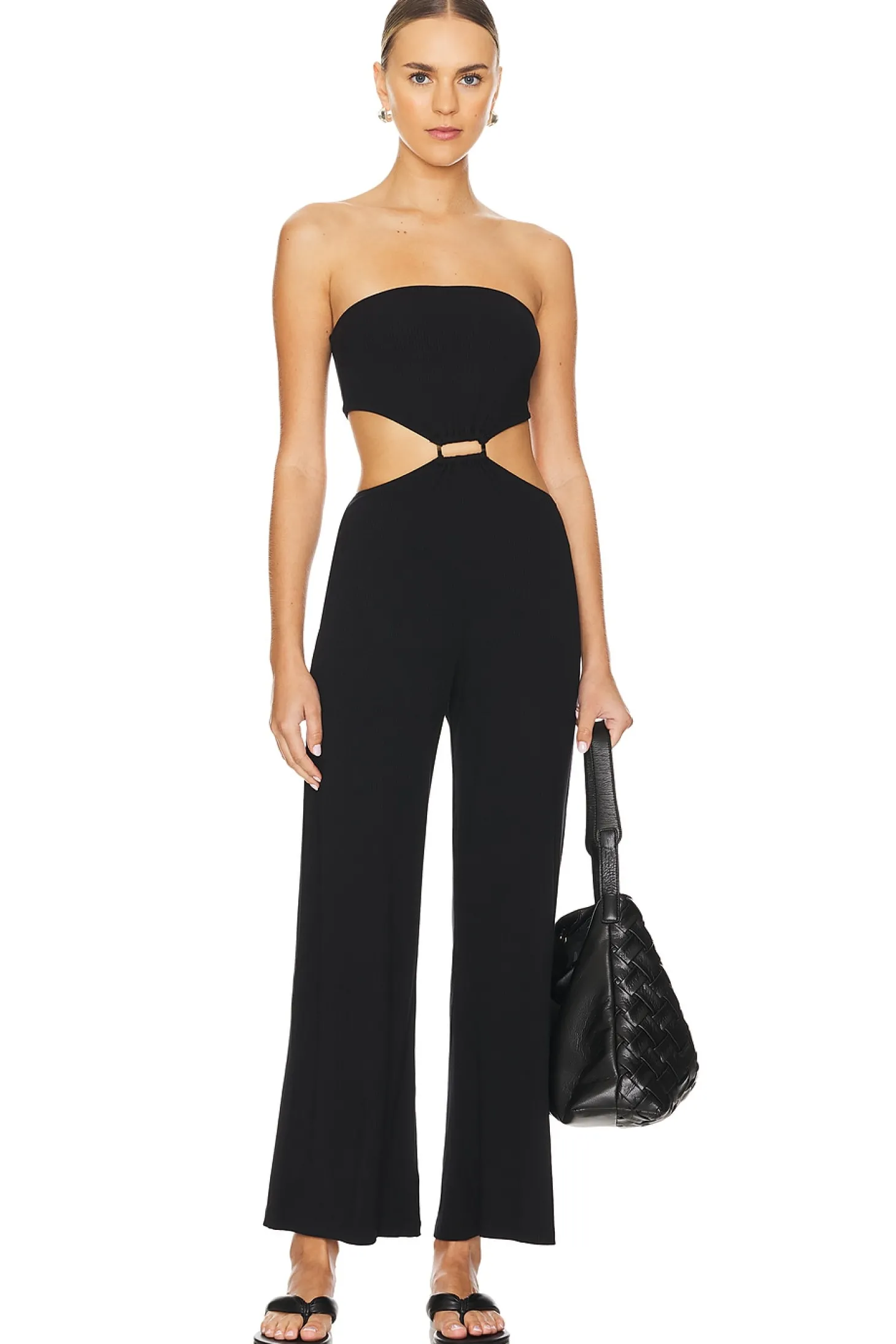 Jersey textile.Made in China.Hand wash recommended.Pull-on styling.Acrylic ring accent at center.Cut-out detail at center.Ribbed jersey fabric.Neckline to hem measures approx 45" in length 24" at the knee and 24" at the leg opening