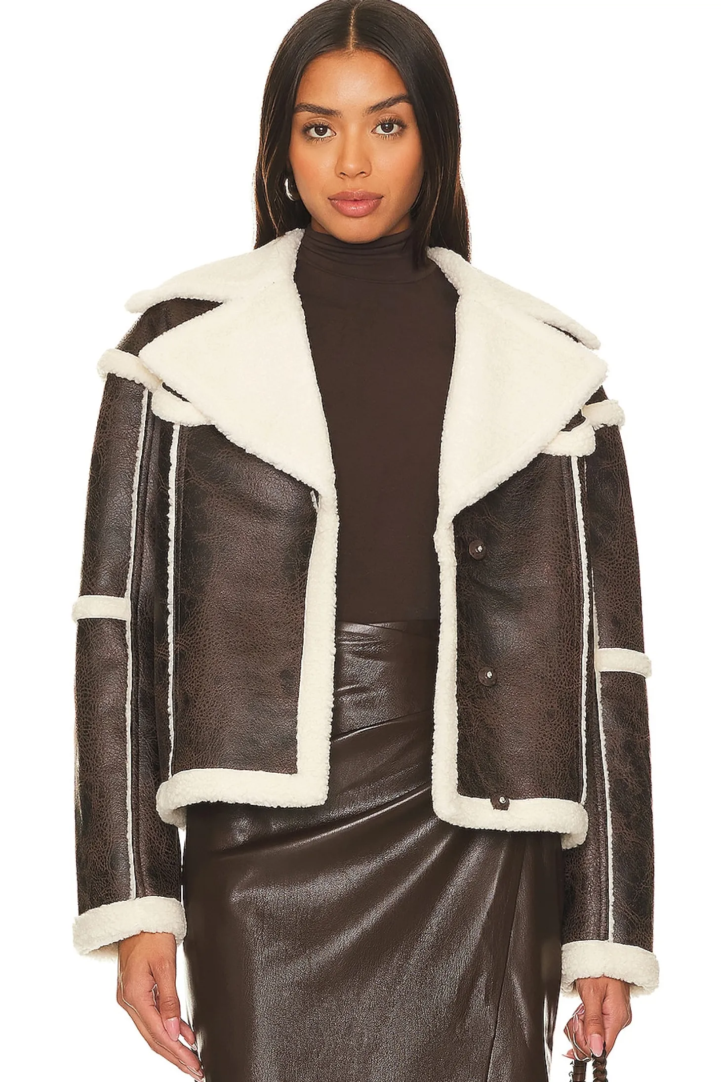 100% polyester.Made in China.Dry clean only.Front snap button closure.Side seam pockets.Distressed faux leather fabric with shearling trim