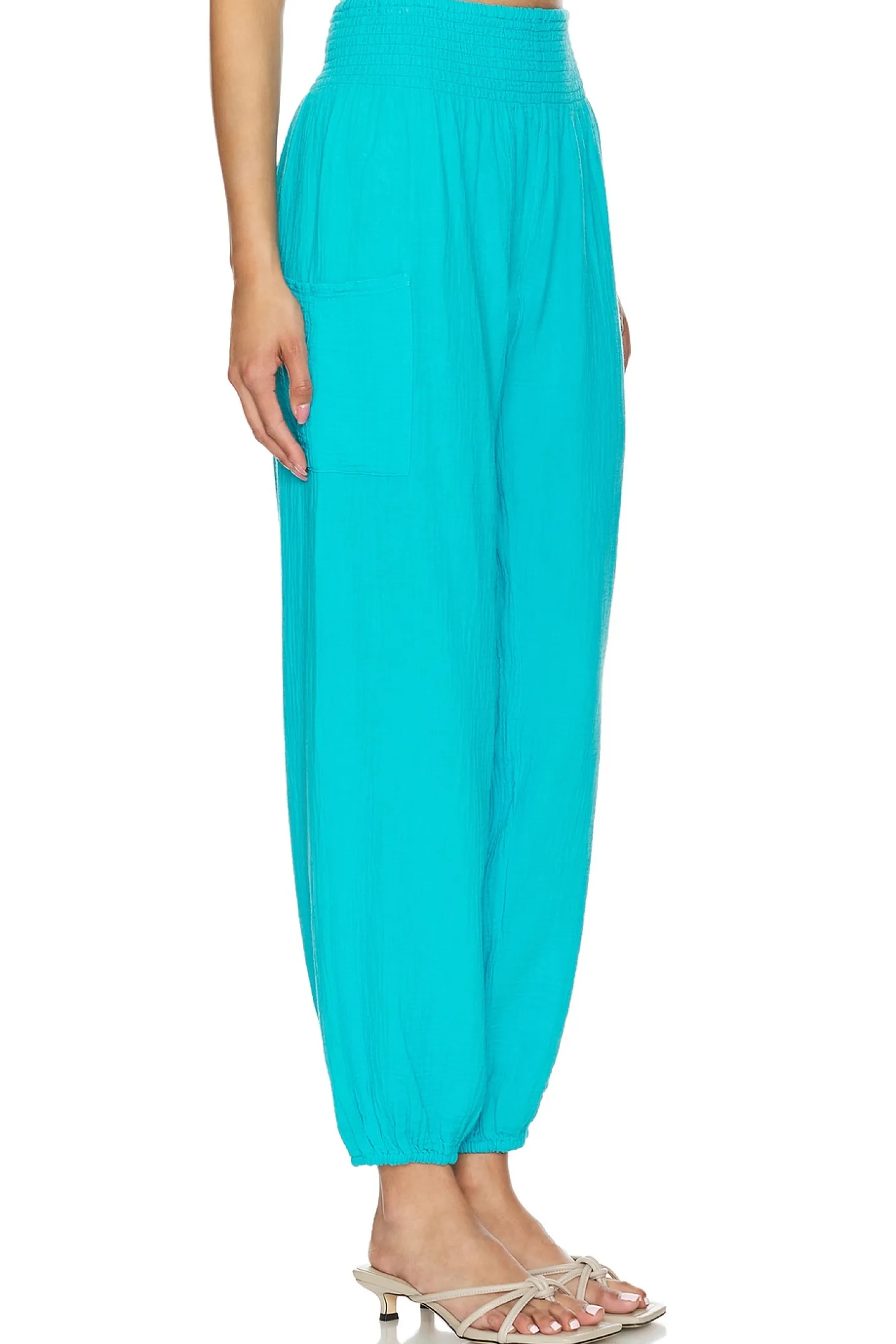 100% cotton.Made in China.Machine wash.Pull-on styling with elastic waistband.Side pouch pockets.Gauze fabric.20" at the knee narrows to 10" at the leg opening