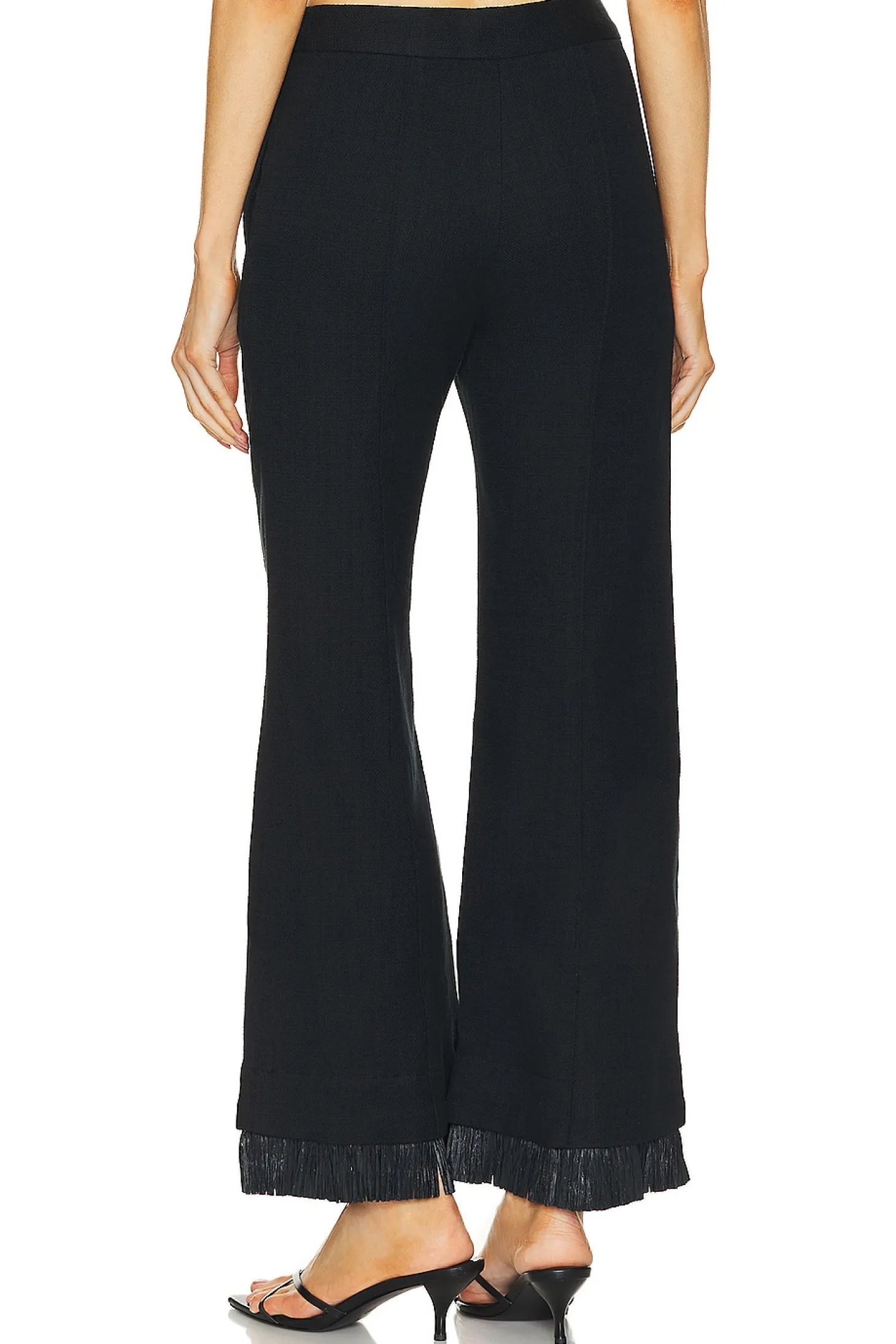 Self: 80% cotton 20% linen Lining: 52% polyester 48% viscose Trim: 100% raffia.Made in China.Dry clean.Zip fly with button closure.Side seam pockets.Raffia trim at hem.Midweight linen fabric Item not sold as a set.19" at the knee breaks to 22" at the leg opening