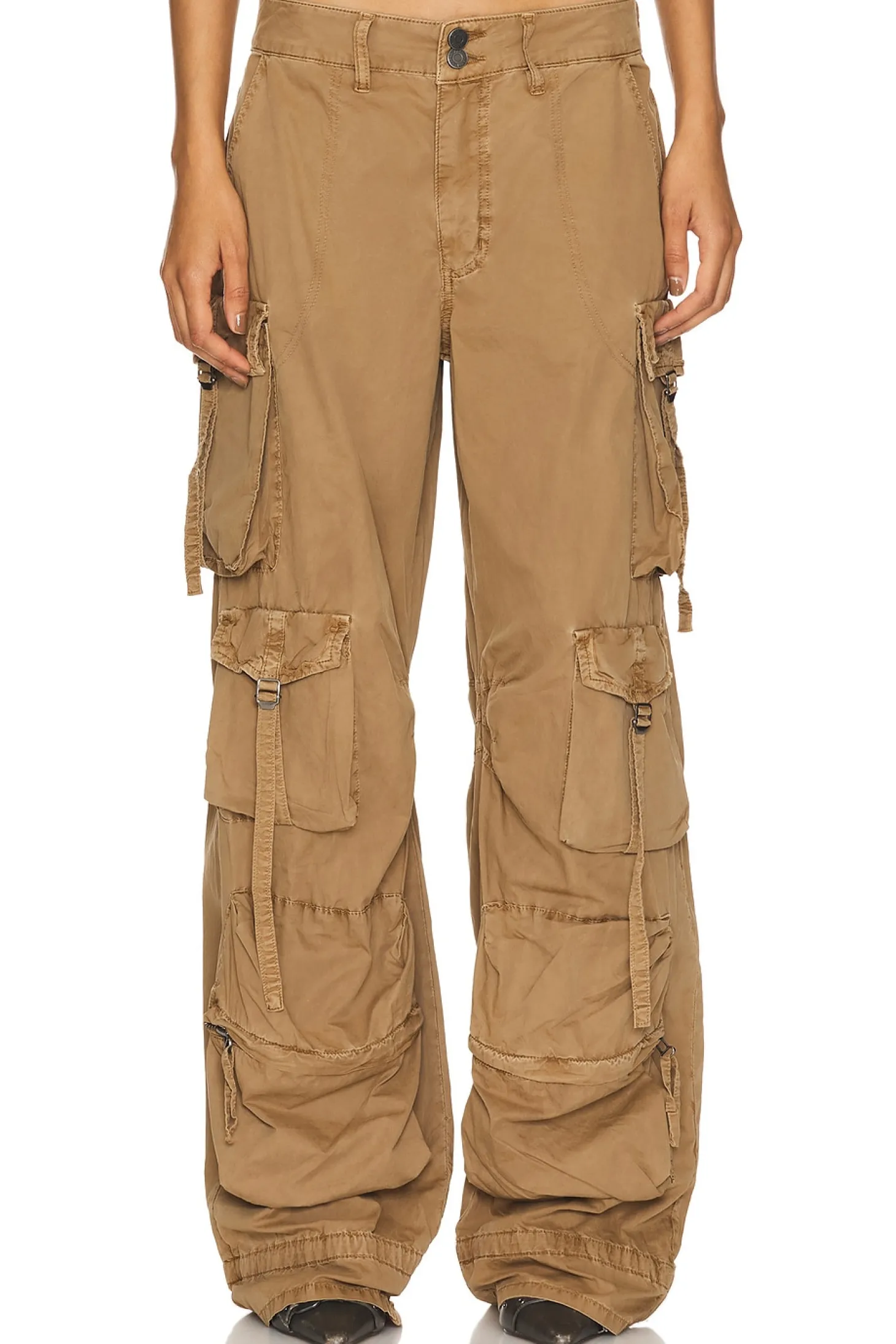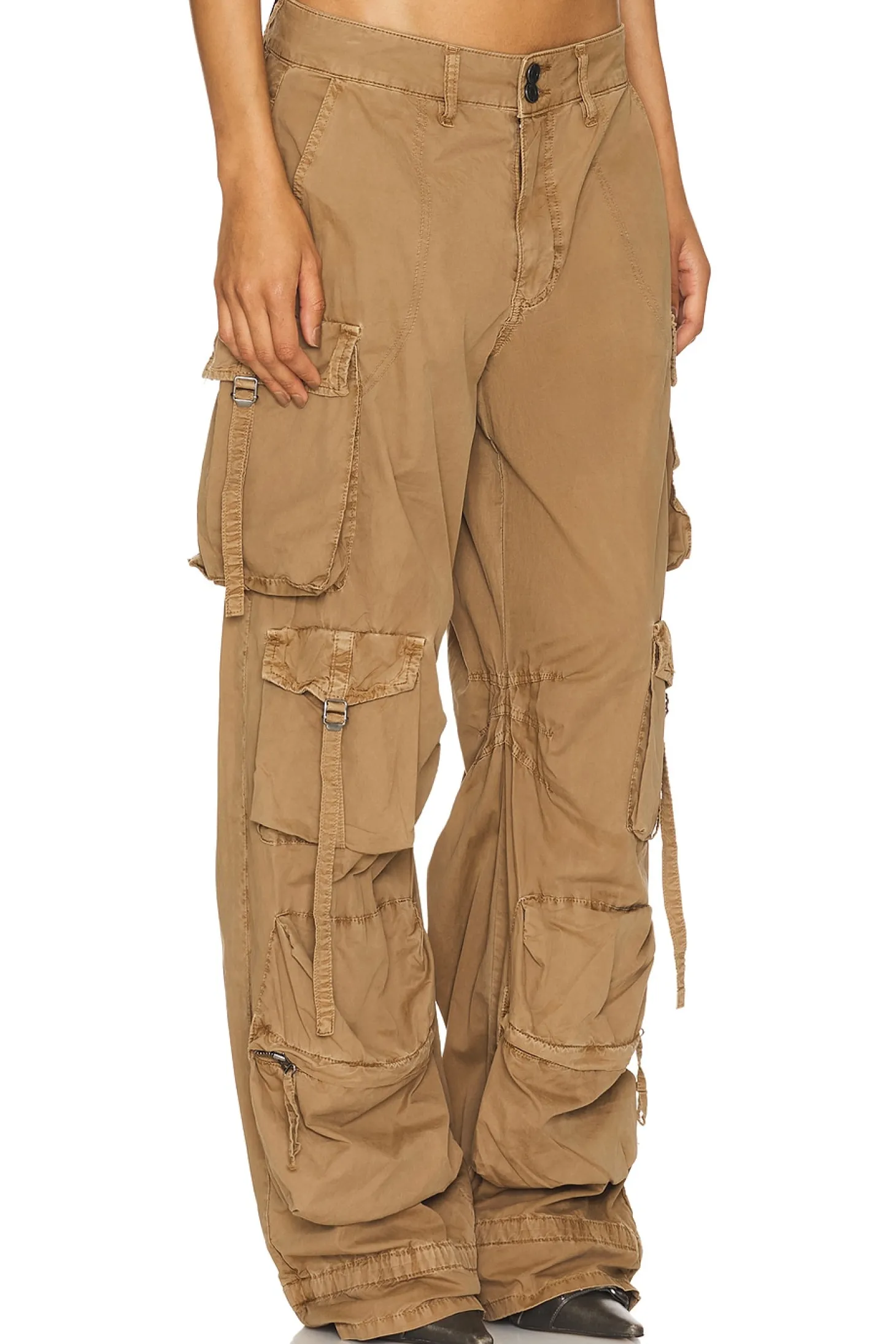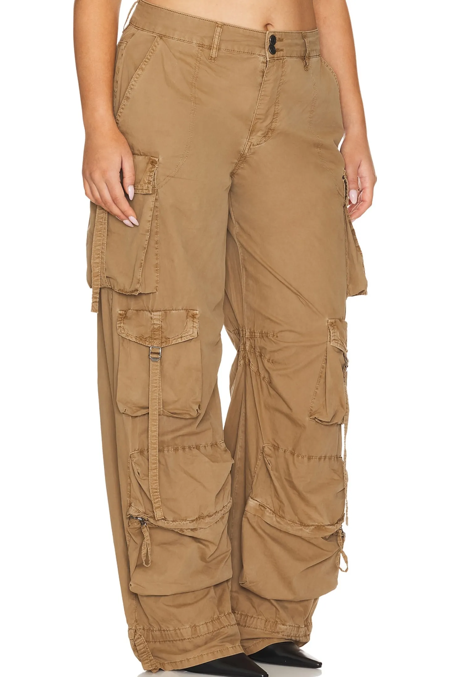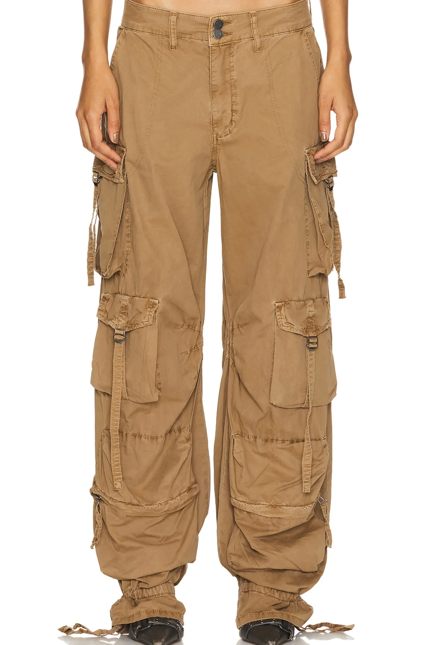 100% cotton.Made in China.Machine wash.Zip fly with button closure.Side seam and cargo pockets.Drawstring detail at cuffs.Lightweight twill poplin fabric Item not sold as a set.25" at the knee narrows to 19" at the leg opening