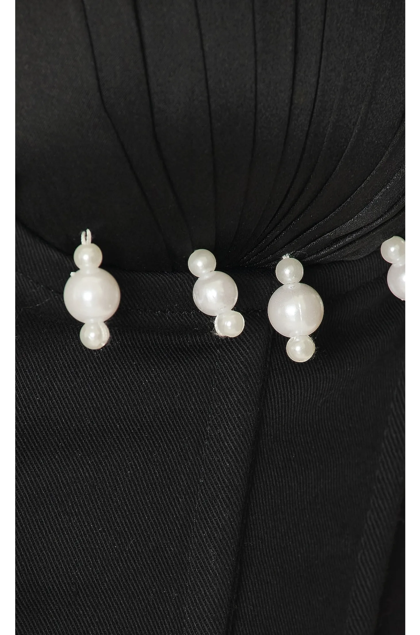 Self 1: 95% polyester 5% spandex Self 2: 100% viscose.Made in Indonesia.Hand wash.Exposed side zipper closure.Lightly padded pleated cups with dangling faux pearl trim.Lace-up front and back tie closure Boned bodice.Twill fabric.Item not sold a set