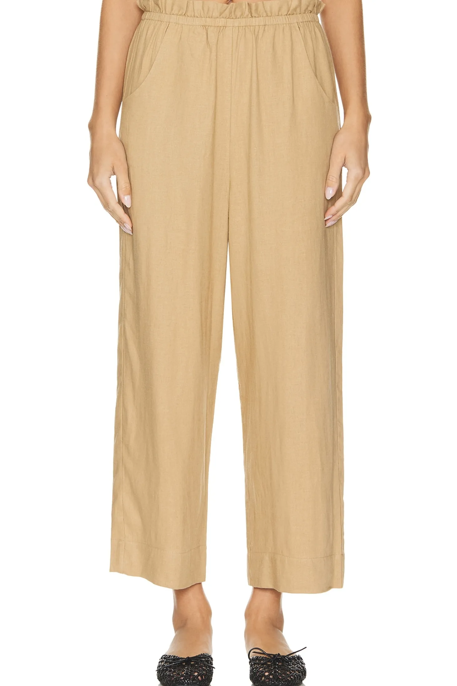 55% linen 45% rayon.Made in USA.Machine wash.Elastic waistband.Side slant pockets.20" at the knee narrows to 18" at the leg opening