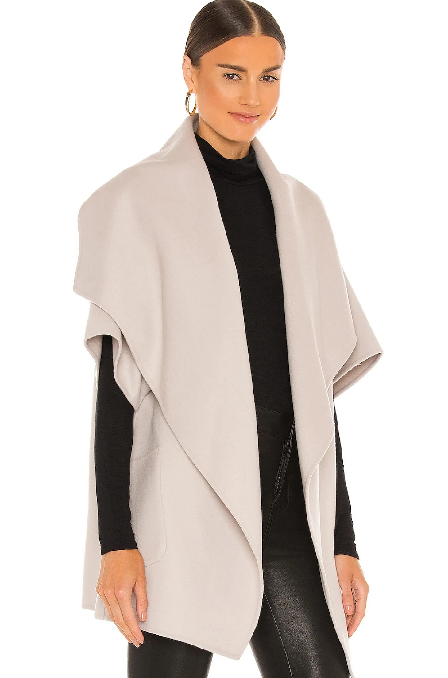 55% wool 45% poly.Made in China.Dry clean only.Open front.Side patch pockets.Kimono sleeves.Draped design with wide lapel