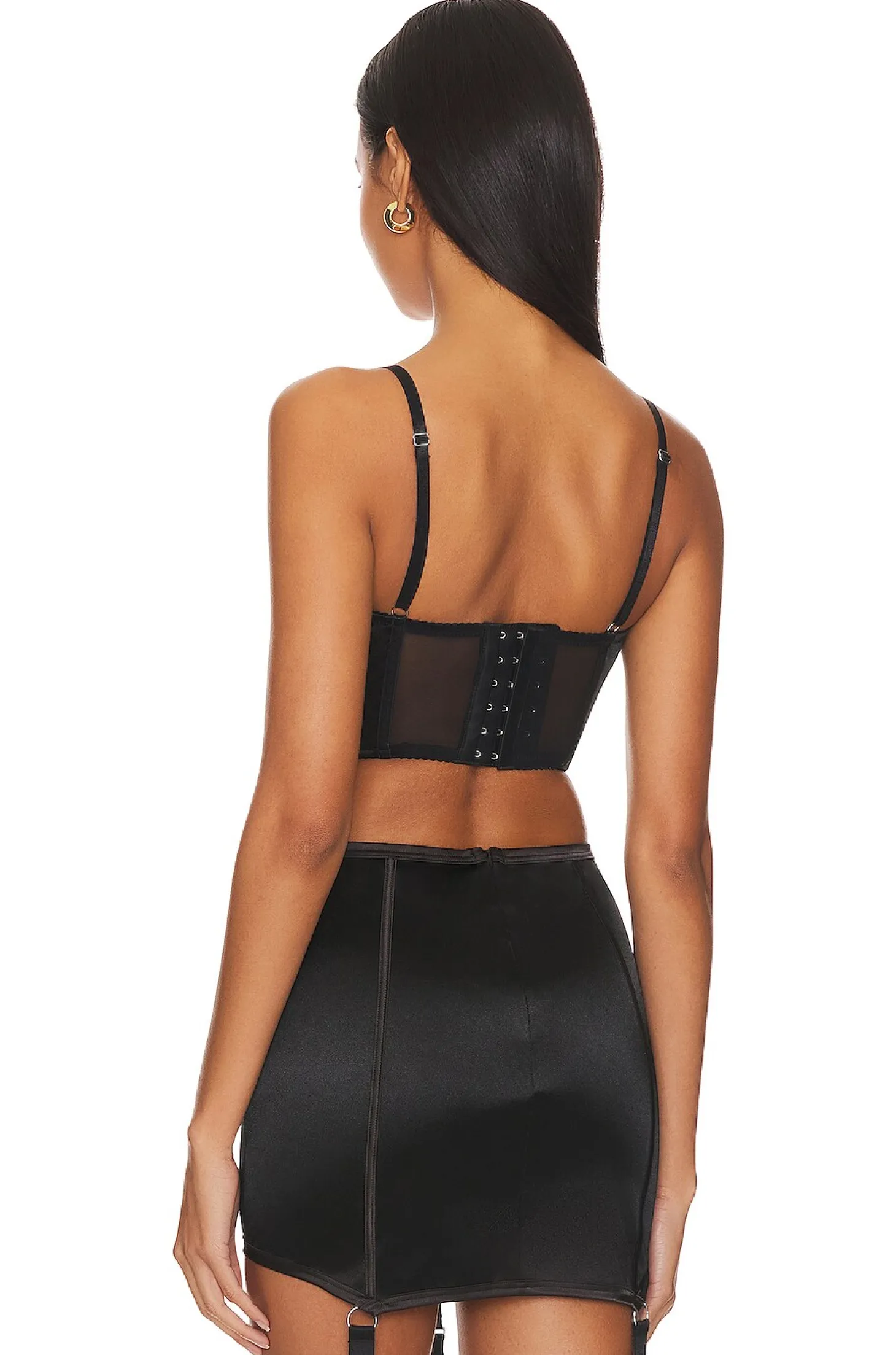 90% polyamide 10% elastane.Made in China.Hand wash.Unpadded underwire cups.Boned bodice with back hook and eye closure.Adjustable shoulder straps.Lace-up front.Mesh, lace and satin fabric Item not sold as a set