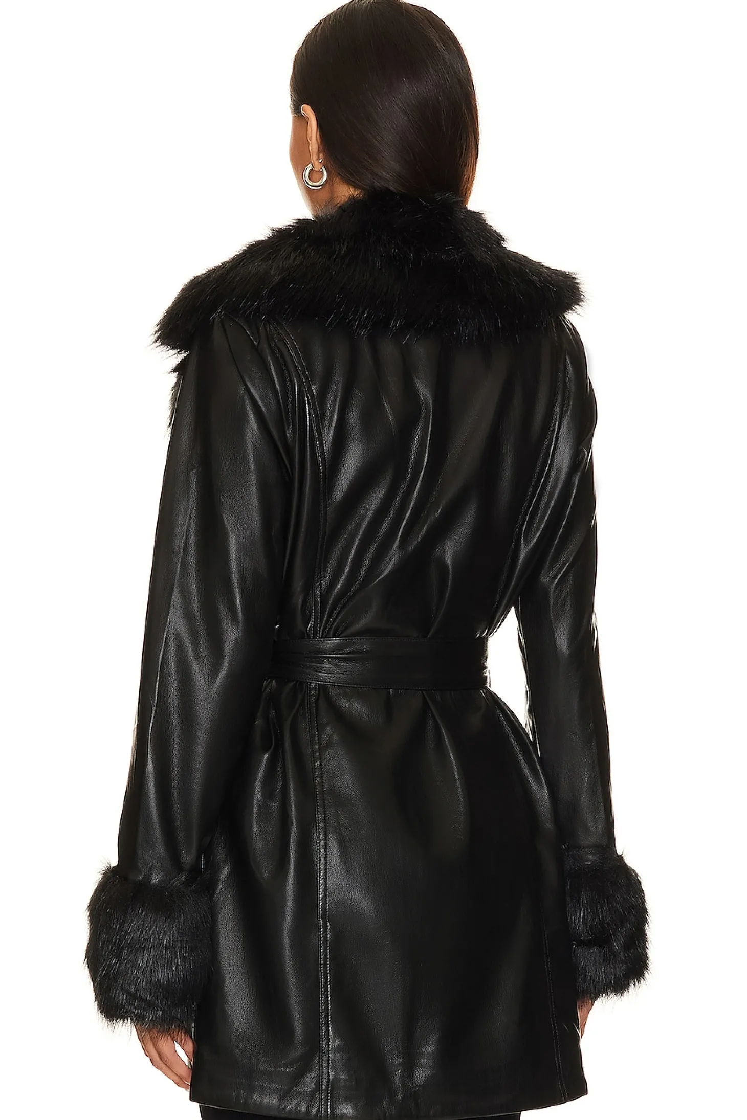 Self 1: 100% polyurethane Self 2: 100% polyester Self 3: 96% polyester 4% spandex Faux Fur: 100% polyester.Made in China.Machine wash.Open front styling with faux leather waist tie closure.Faux leather fabric with faux fur collar and cuff