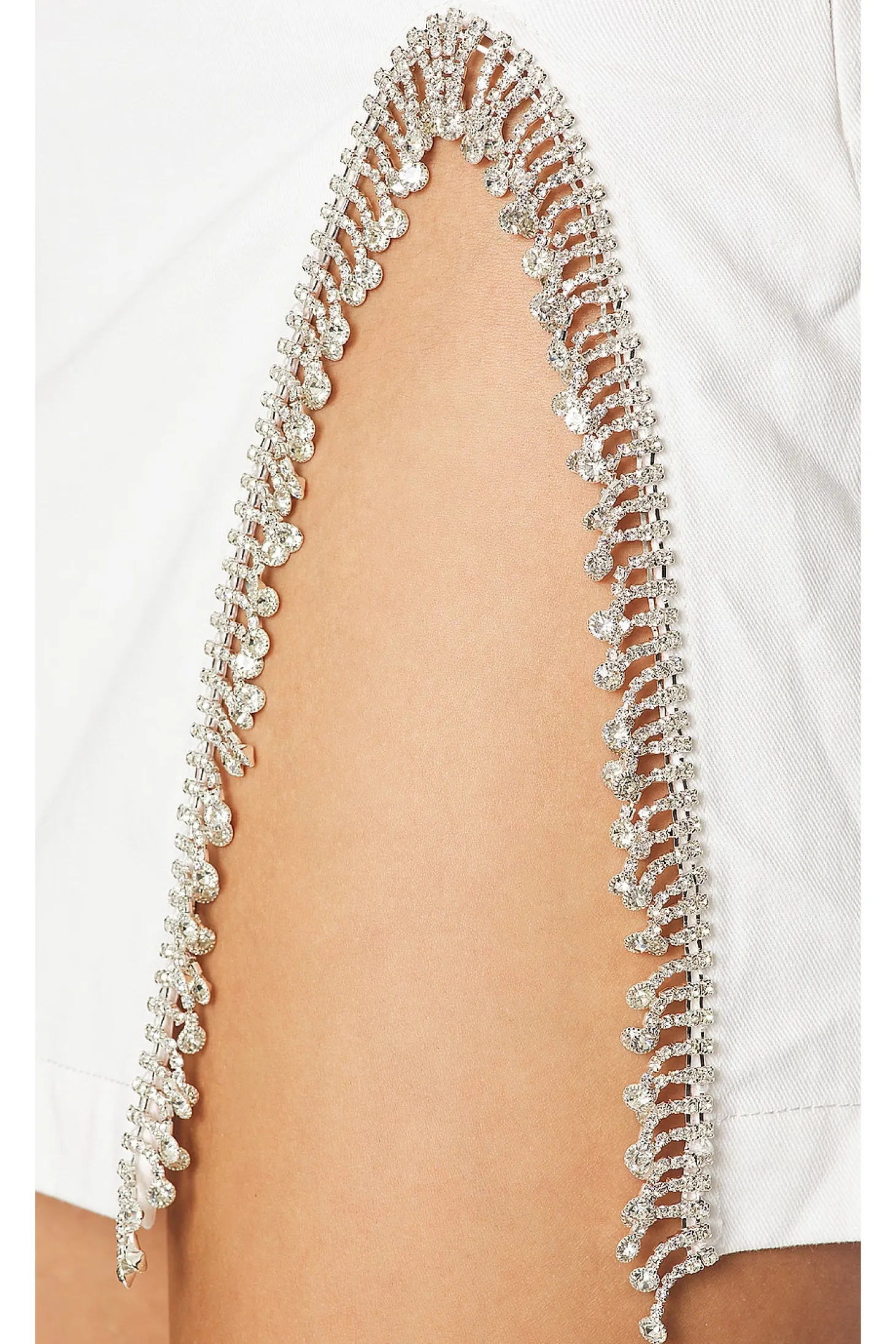100% cotton.Made in China.Dry clean only.Unlined.Hidden side zipper closure.Lightweight twill fabric crystal embellished trim.Item not sold as a set.Skirt measures approx 12" in length