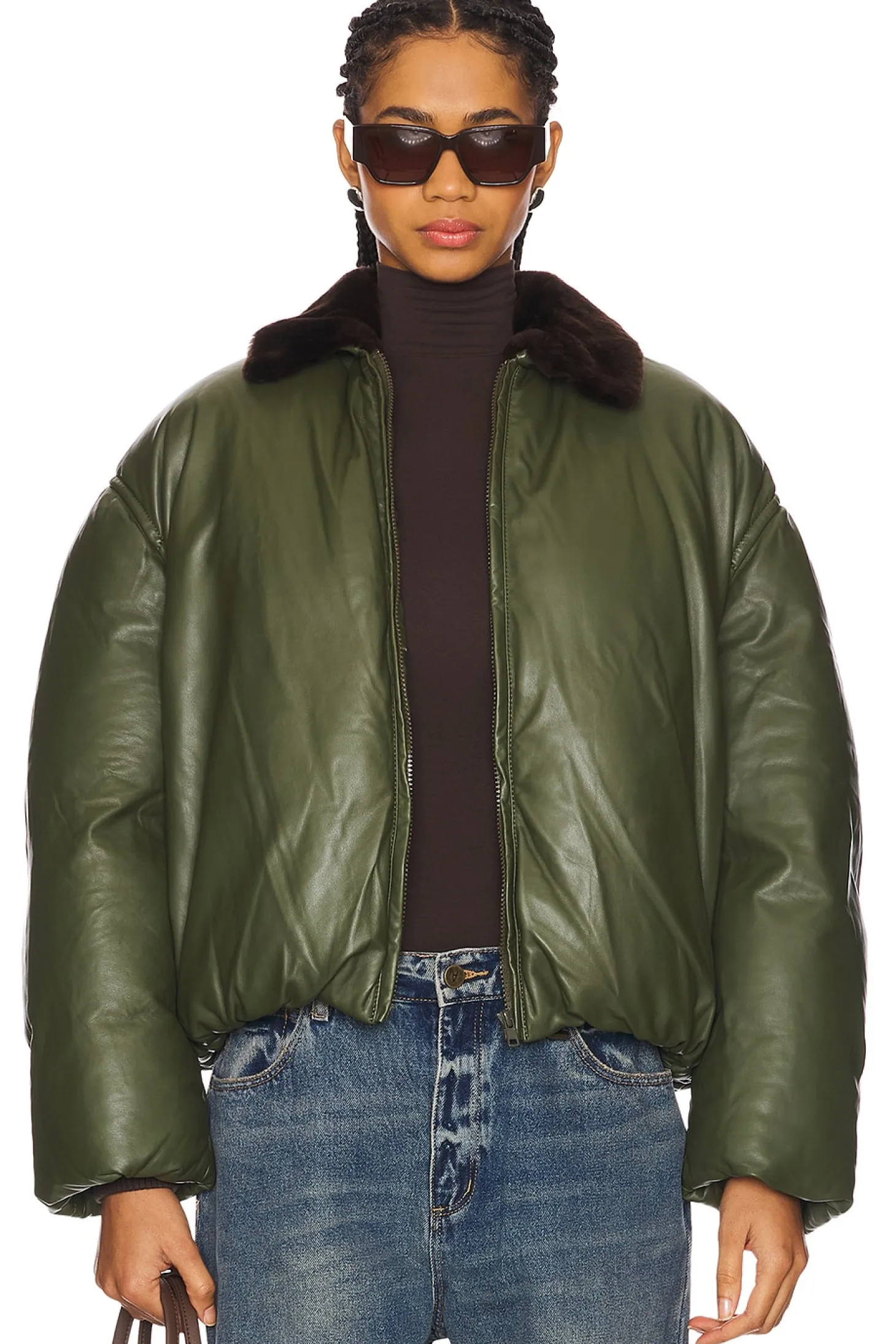Self: 100% lambskin leather Lining: 100% polyester Contrast Fabric: 100% dyed shearling.Made in Turkey Fur Origin: Turkey.Professional leather clean only.Hidden front zipper closure.Side seam pockets.Pull-cord waistband.Padded leather
