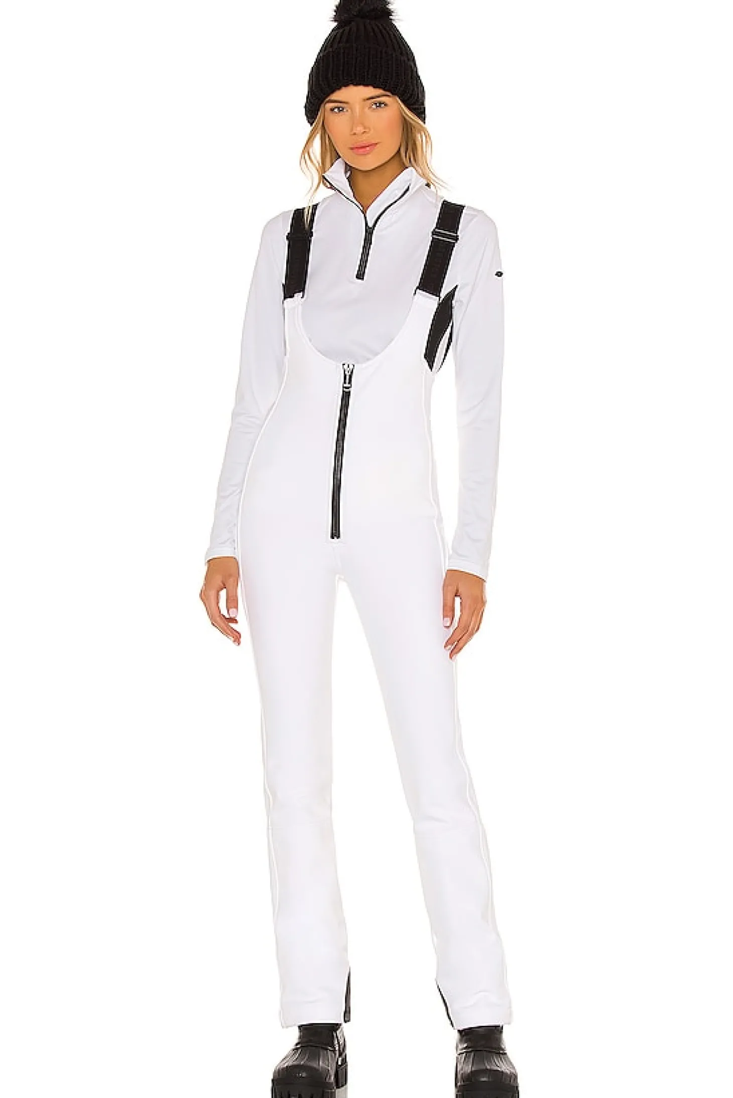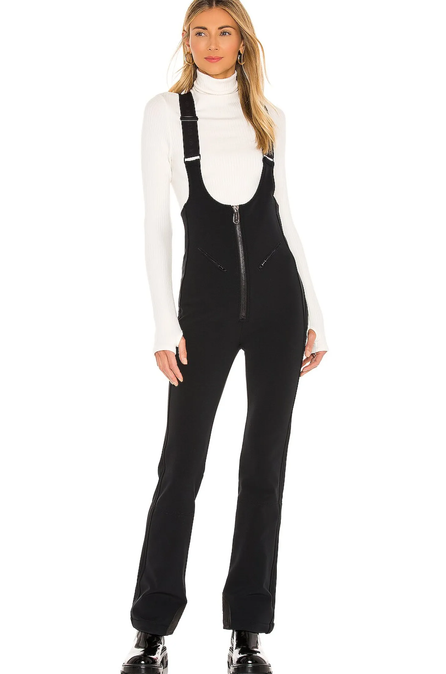 Self: 49% poly 30% polyamide 12% polyurethane 9% elastane Lining: 100% polyamide Fill: 100% poly.Partial front zipper closure and front zipper pockets.Adjustable suspender straps.Fleece lining.Windproof, water repellant and breathable.Snow catchers in trouser legs and ankle zipper detail.Measures approx 57" in length 14" at the knee breaks to 16" at the leg opening.Imported