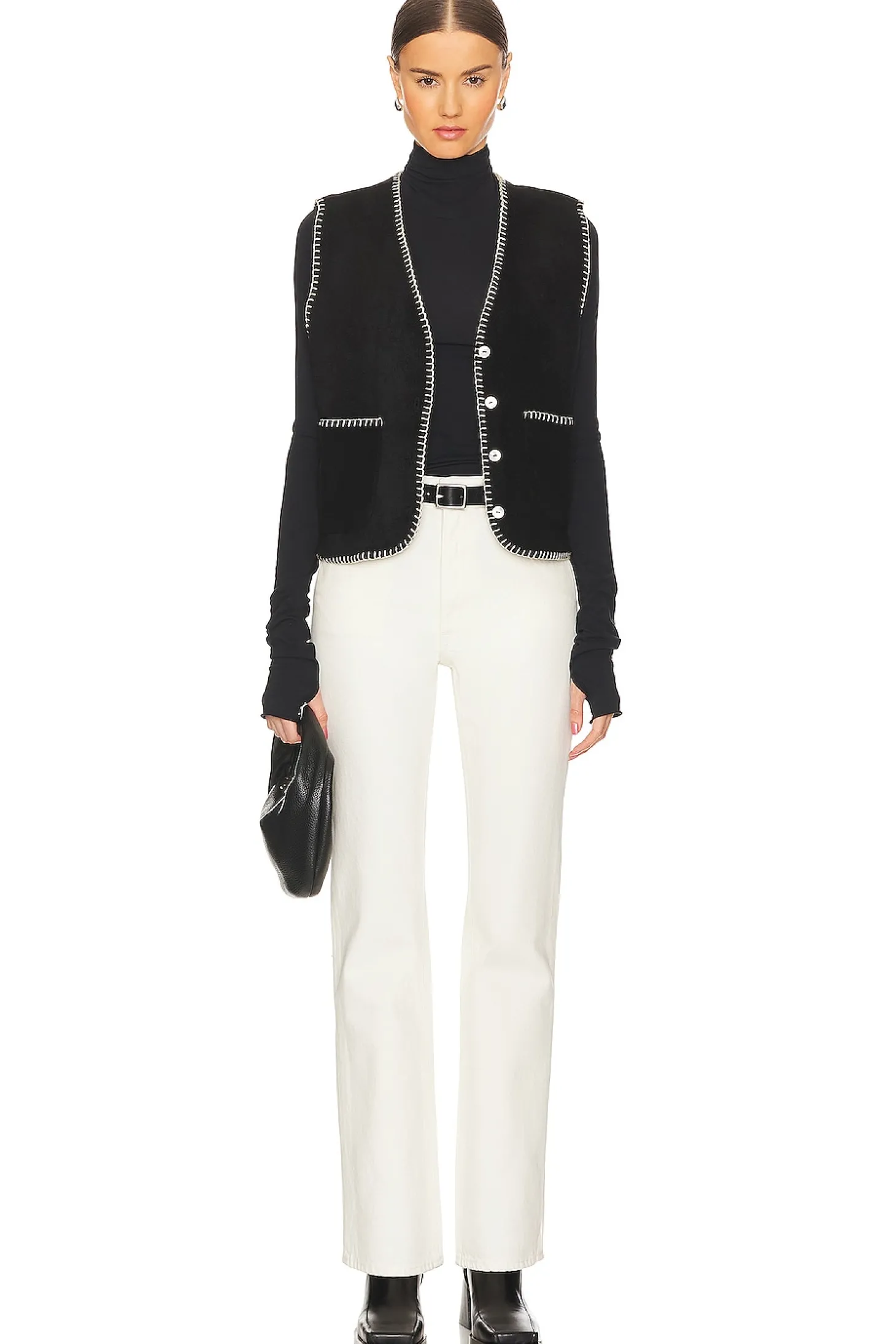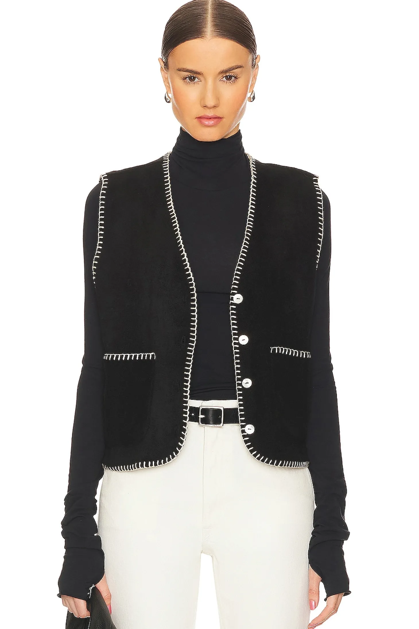 100% polyester.Made in USA.Machine wash.Front button closure.Side slip pockets.Melton fabric with contrast trim