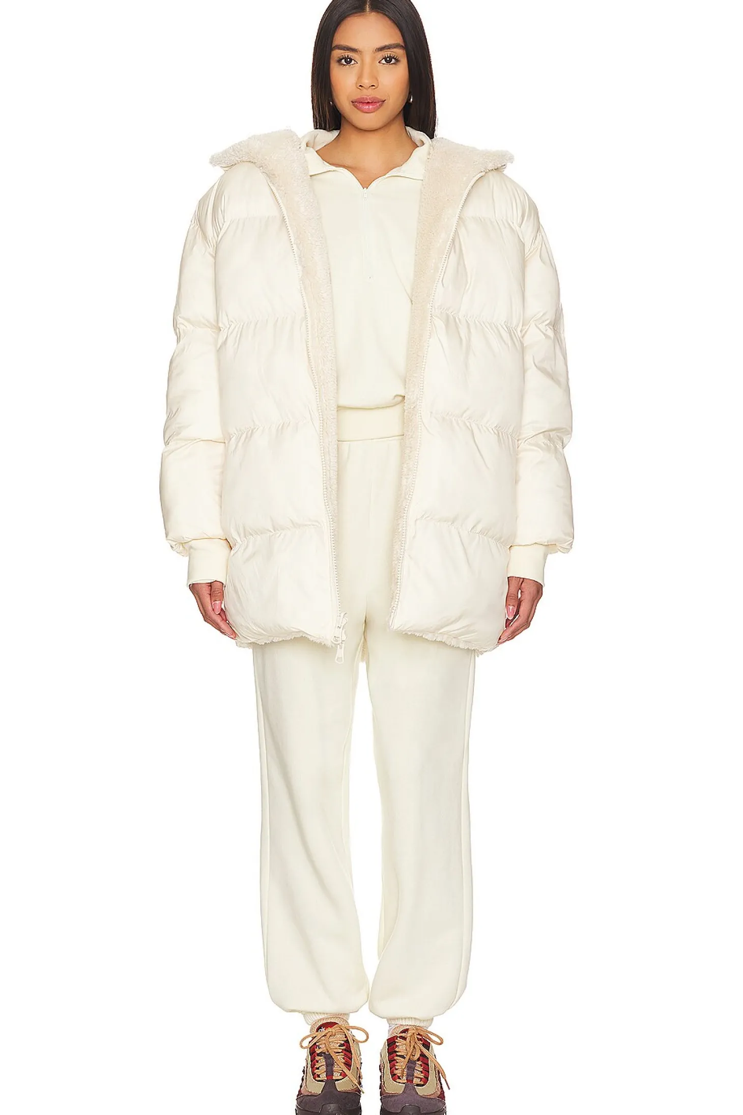 Self & Lining: 100% recycled polyester Filling: 100% polyester.Made in China.Dry clean only.Front zipper closure.Attached hood with faux fur lining.Puffer style ripstop fabric.Reversible styling