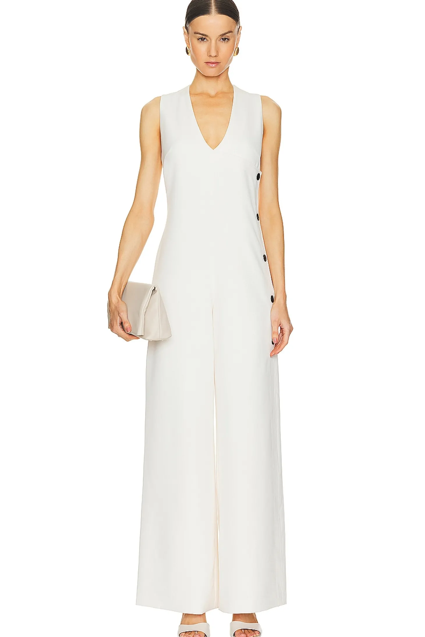 Self: 88% polyester 12% elastane Lining: 100% polyester.Made in China.Dry clean.Hidden back zipper closure.Side faux button detail.Split cuffs.Midweight crepe fabric