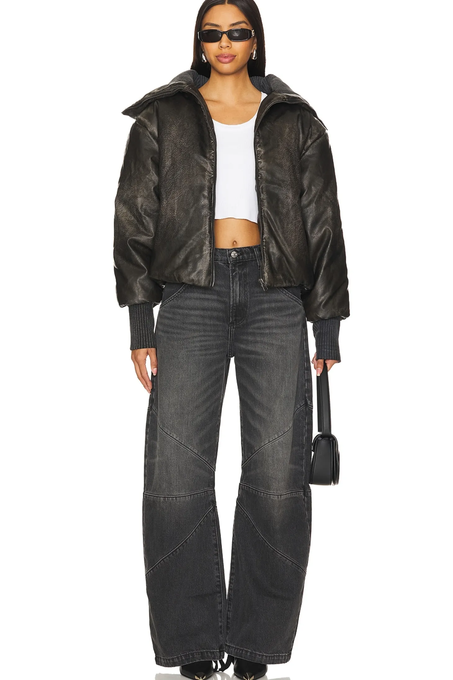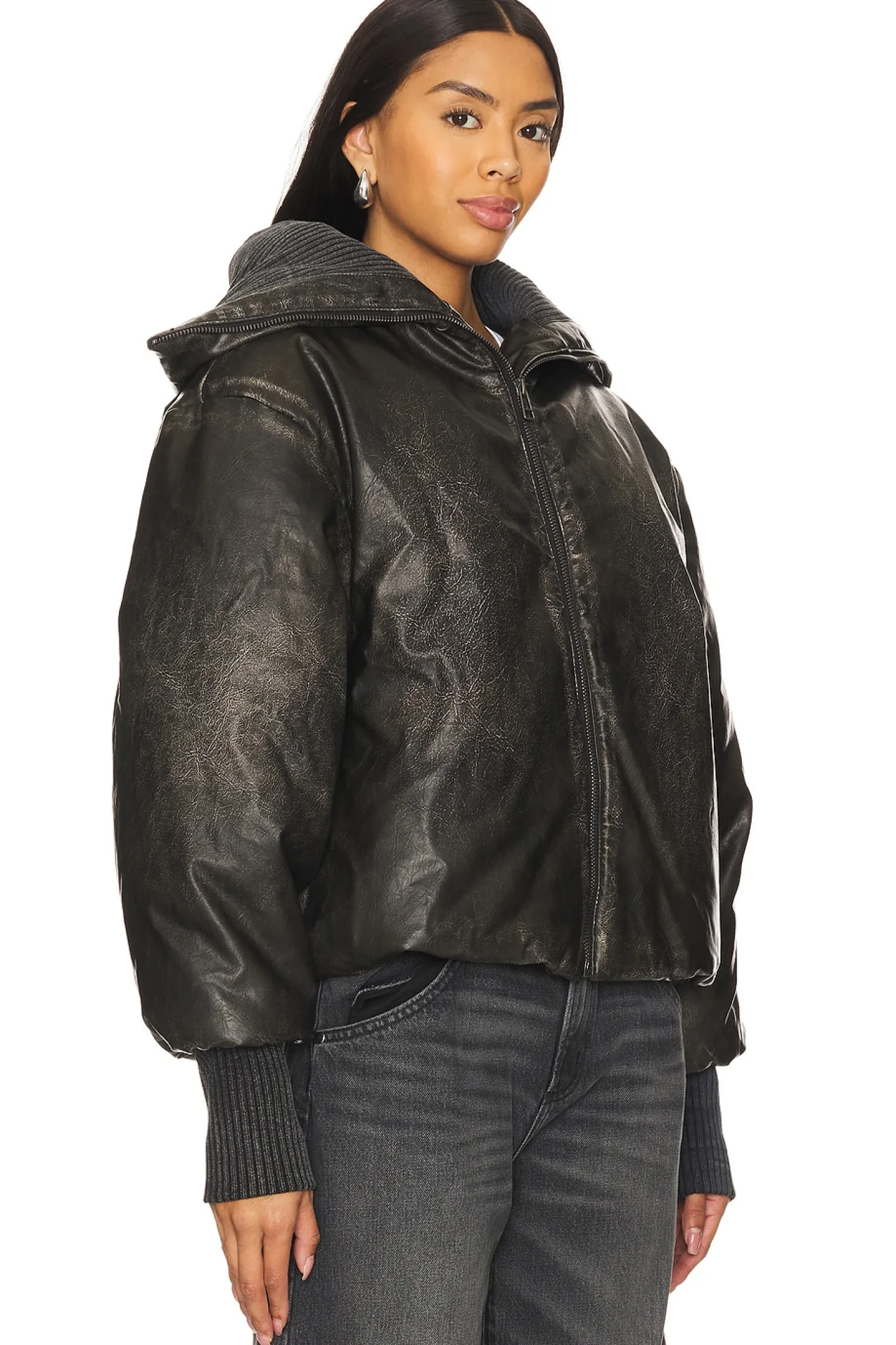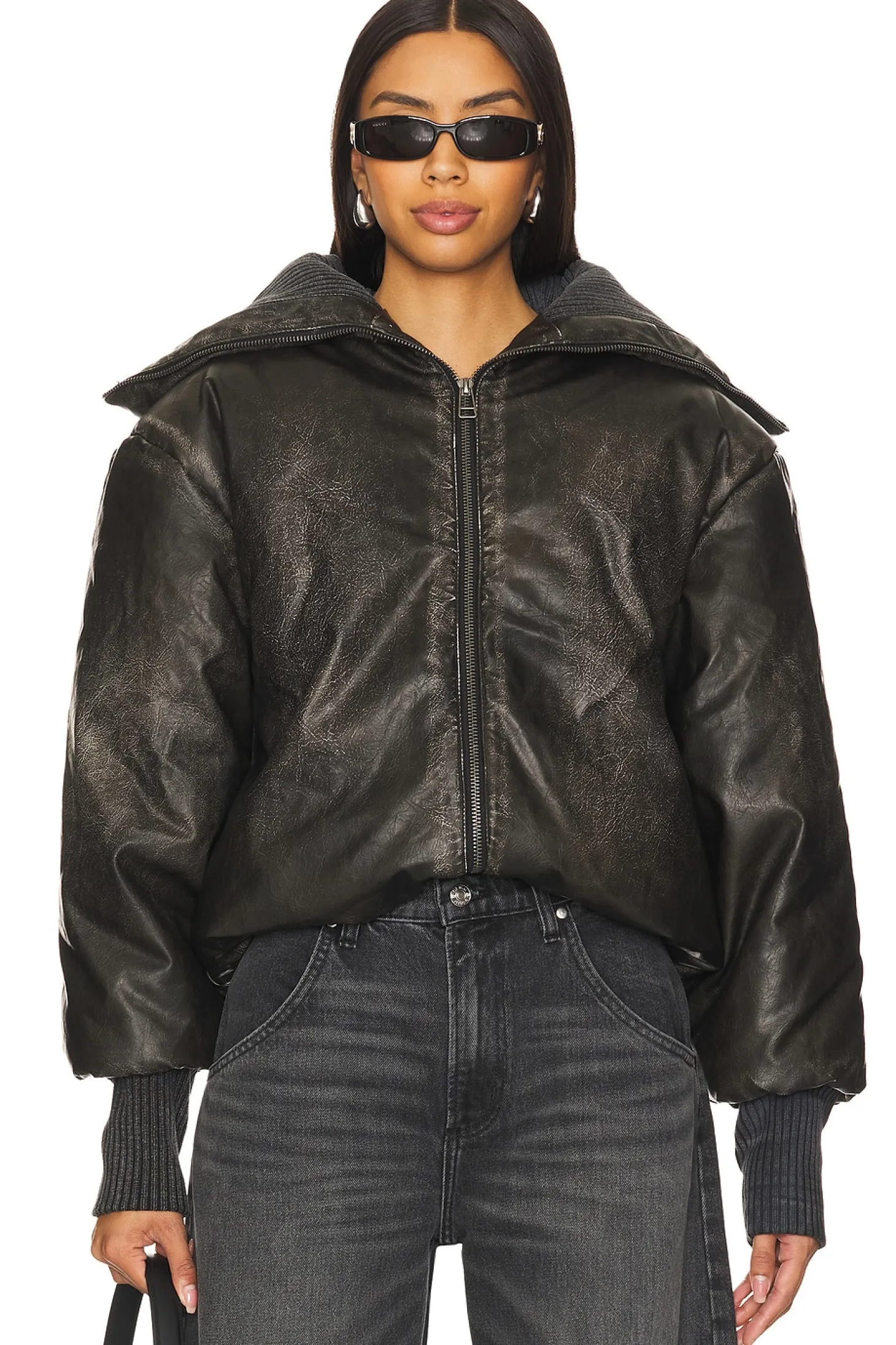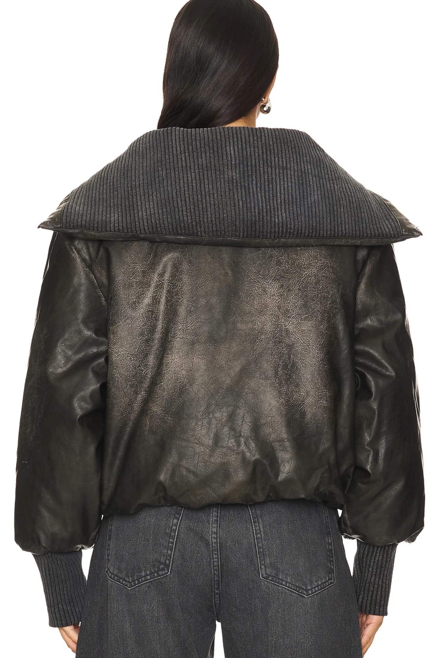 Faux Leather.Made in China.Wipe clean.Front zipper closure.Distressed.Distressed.Ribbed knit design on collar and cuffs