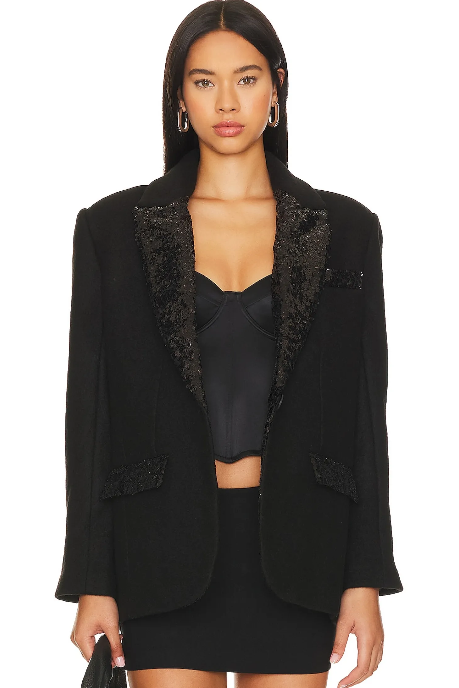 Step into the spotlight with the NBD Black Quincy Blazer. Featuring sequin-embellished trim, this bedazzled statement jacket is your ticket to head-turning style..Self: 100% wool Contrast Fabric: 100% polyester Lining: 55% polyester 45% viscose.Made in China.Dry clean only.Singular front button closure.Front welt pockets.Padded shoulders.Midweight melton fabric with sequin embellished trim