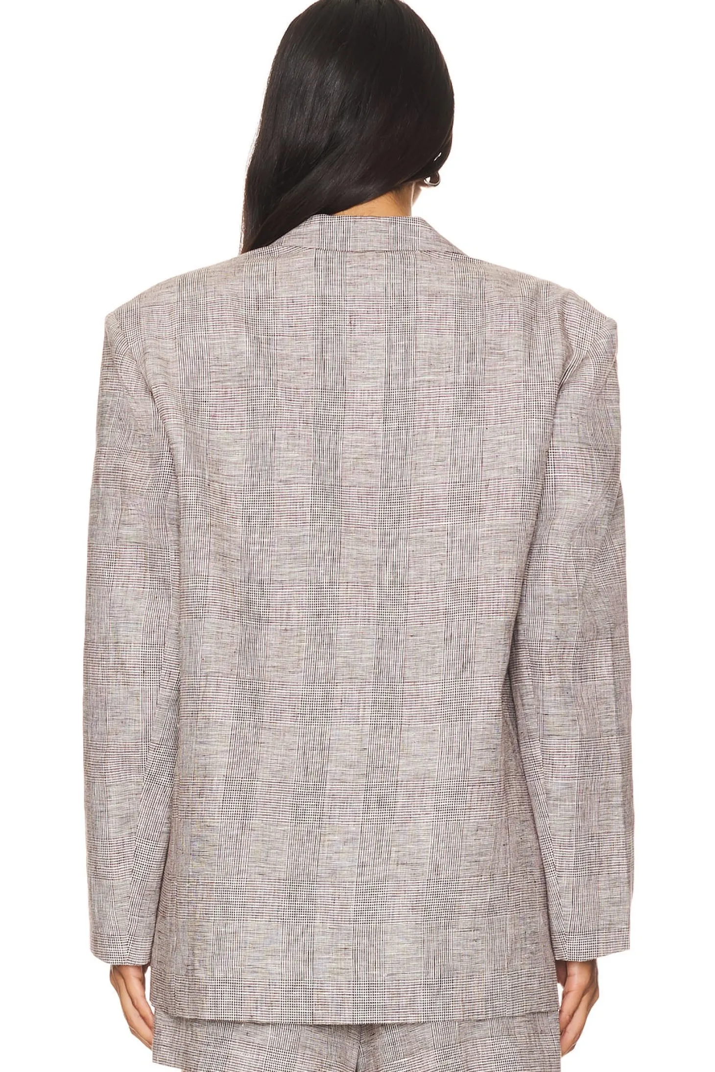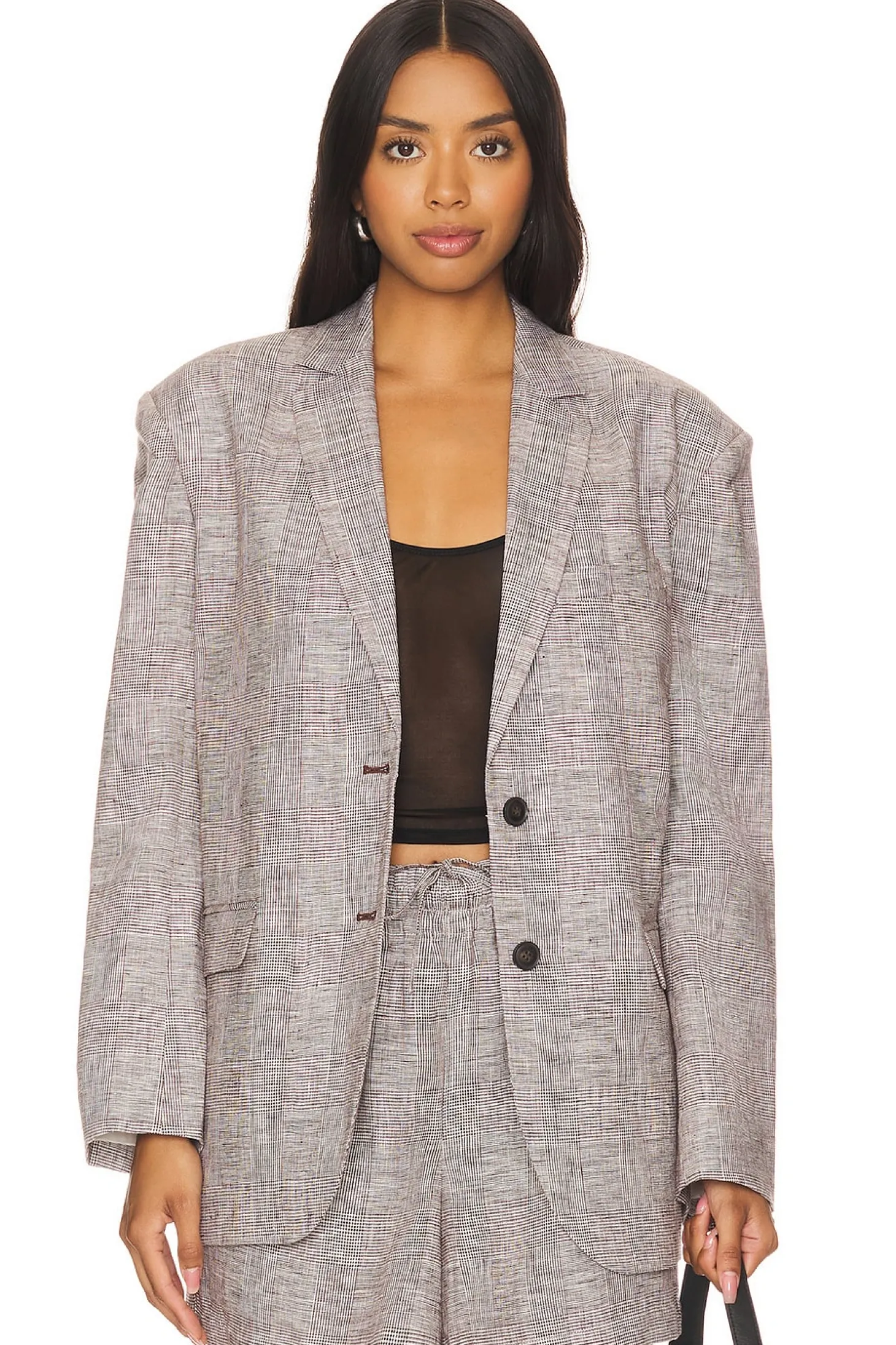 Self: 100% linen Lining: 57% polyester 43% viscose.Made in China.Machine wash.Front button closure.Front pockets and breast pockets.Attached shoulder pads.Item not sold as set.Linen fabric