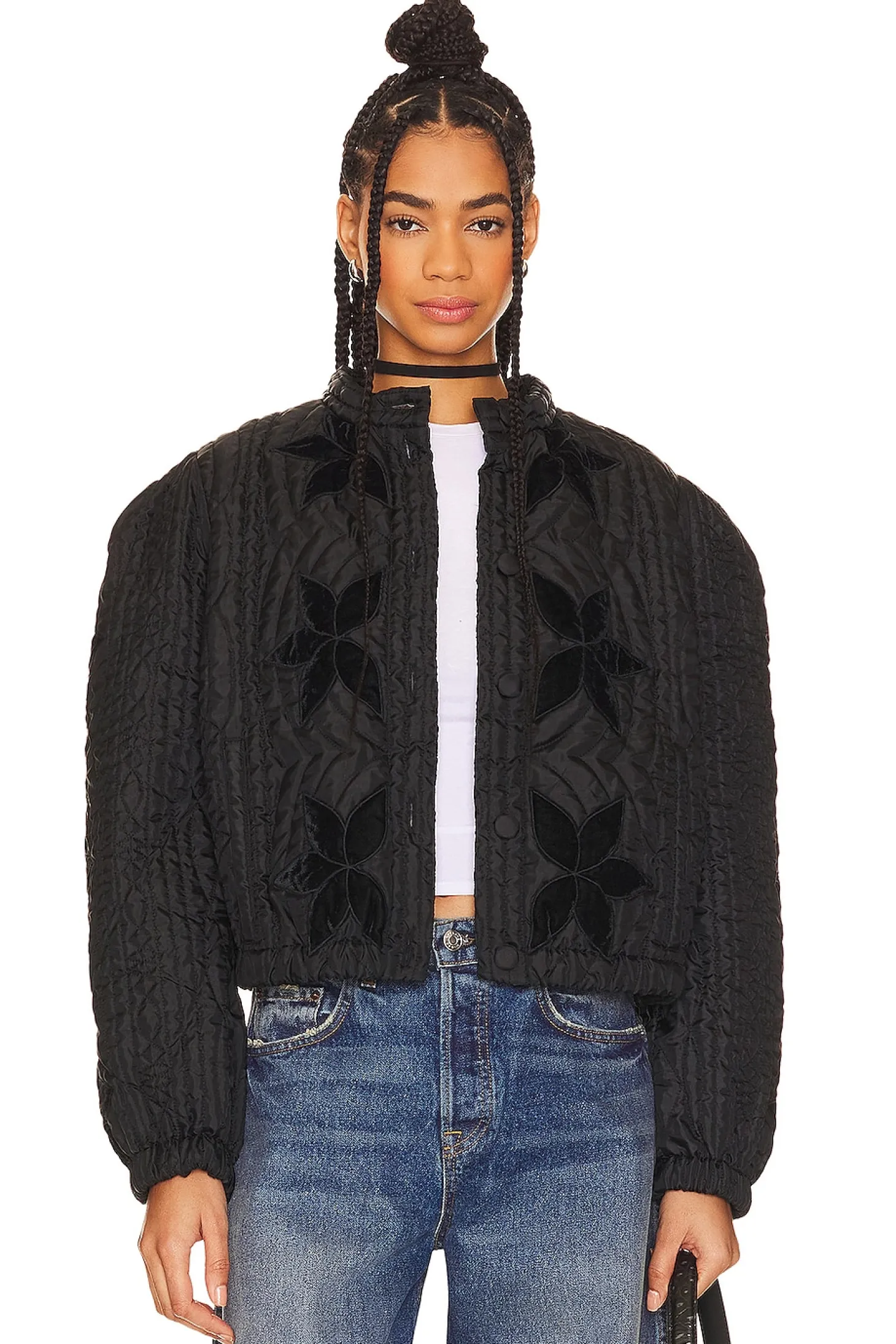Elevate your casual style with the Free People Quinn Quilted Jacket in Black. Crafted from quilted ripstop fabric, this jacket is not just a layering essential but a fashion statement. The velvet floral design adds a touch of romance, while the boxy shoulders give it a modern edge. Perfect for those chilly days when you want to stay warm without sacrificing style..100% polyester.Made in India.Dry clean only.Front button closure.Structured shoulders.Side seam pockets.Lightweight quilted ripstop fabric with velvet floral design